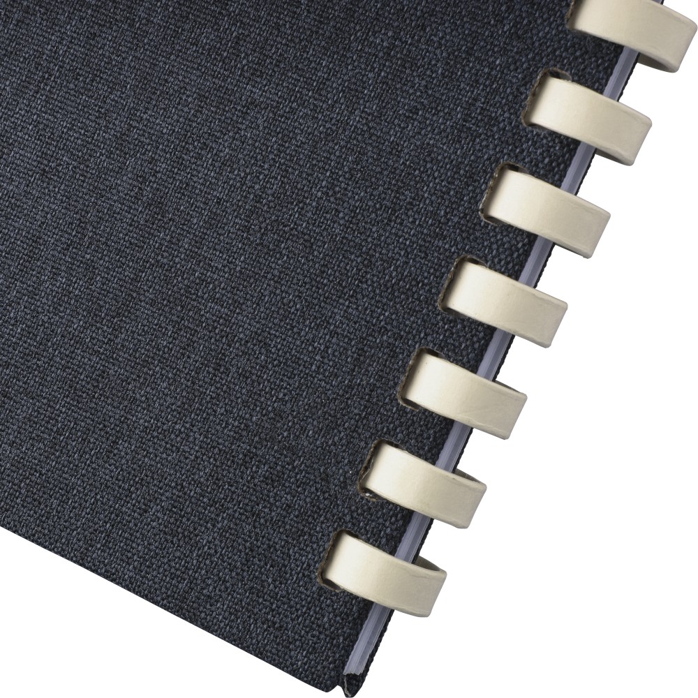 rPET jegyzetfüzet, kb. A5-ös méretű, 80 lapos. Kemény borítóval és rugalmas zárópánttal. Fehér karton spirállal (15 karikás), szalagos könyvjelzővel és 70 g/m2-es vonalas papírral. A hátoldalon rPET logóval. Selyempapírba csomagolva, nejlonzacskó nélkül. Emblémázás: Szitanyomás