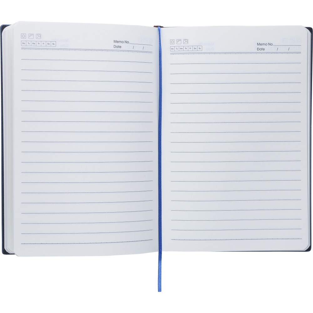 Újrahasznosított PU jegyzetfüzet, kb. A5-ös méretű, 100 lapos. Kemény borítóval és kordbársony hatású bevonattal az elülső és a hátlap felső részén. Tartalmaz egy szalagos könyvjelzőt és 80 g/m2-es vonalas lapokat. A hátoldalon dombornyomott újrahasznosított logóval. Emblémázás: Szitanyomás