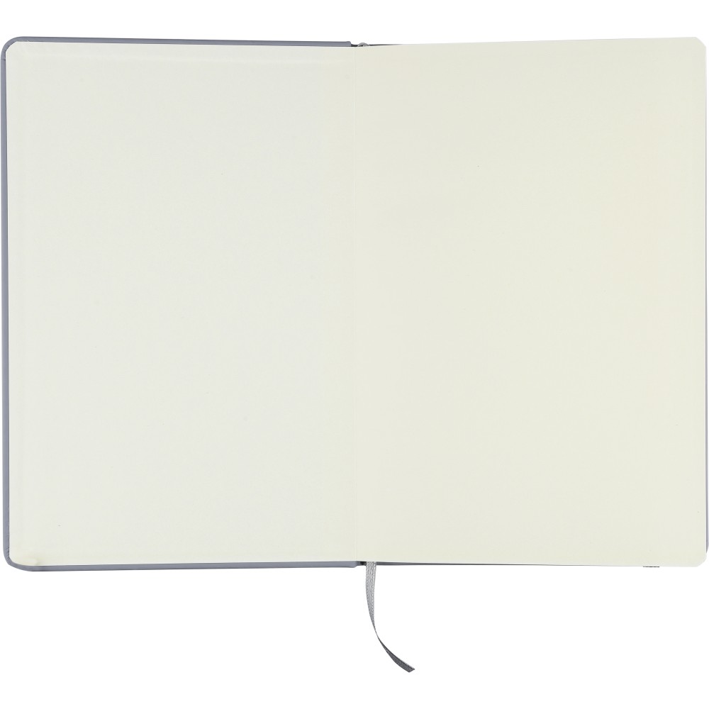 A5-ös méretű jegyzetfüzet rPET PU anyagból készült kemény borítóval, 80 vonalas lappal (70g/m2), színben illeszkedő gumipánttal és könyvjelző szalaggal. Az újrahasznosított anyagra utaló dombornyomott logóval a füzet hátoldalán. Emblémázás: Szitanyomás, Tamponnyomás, UV nyomtatás