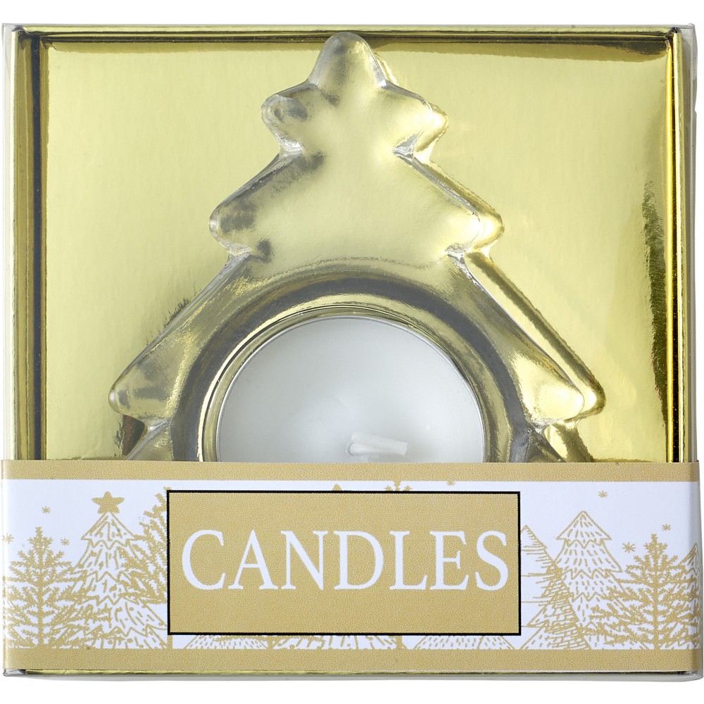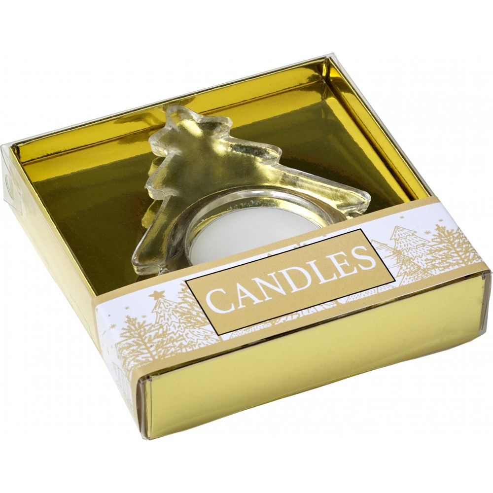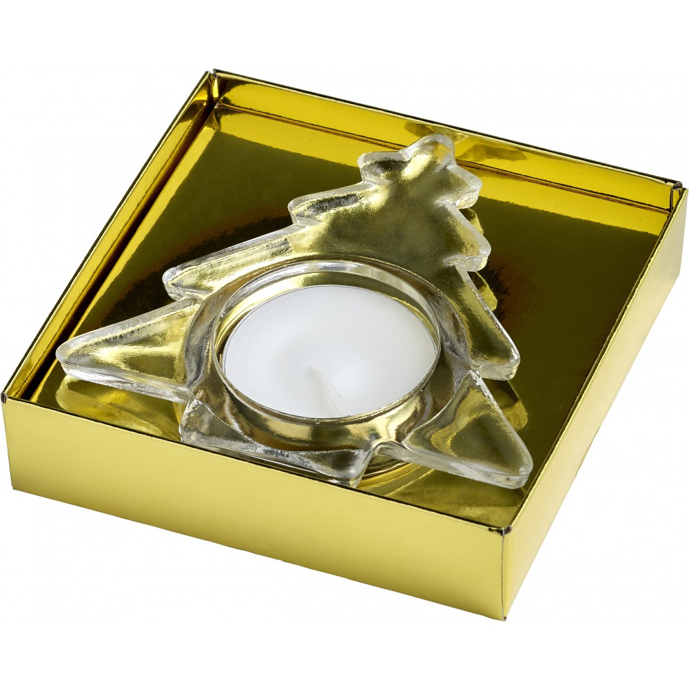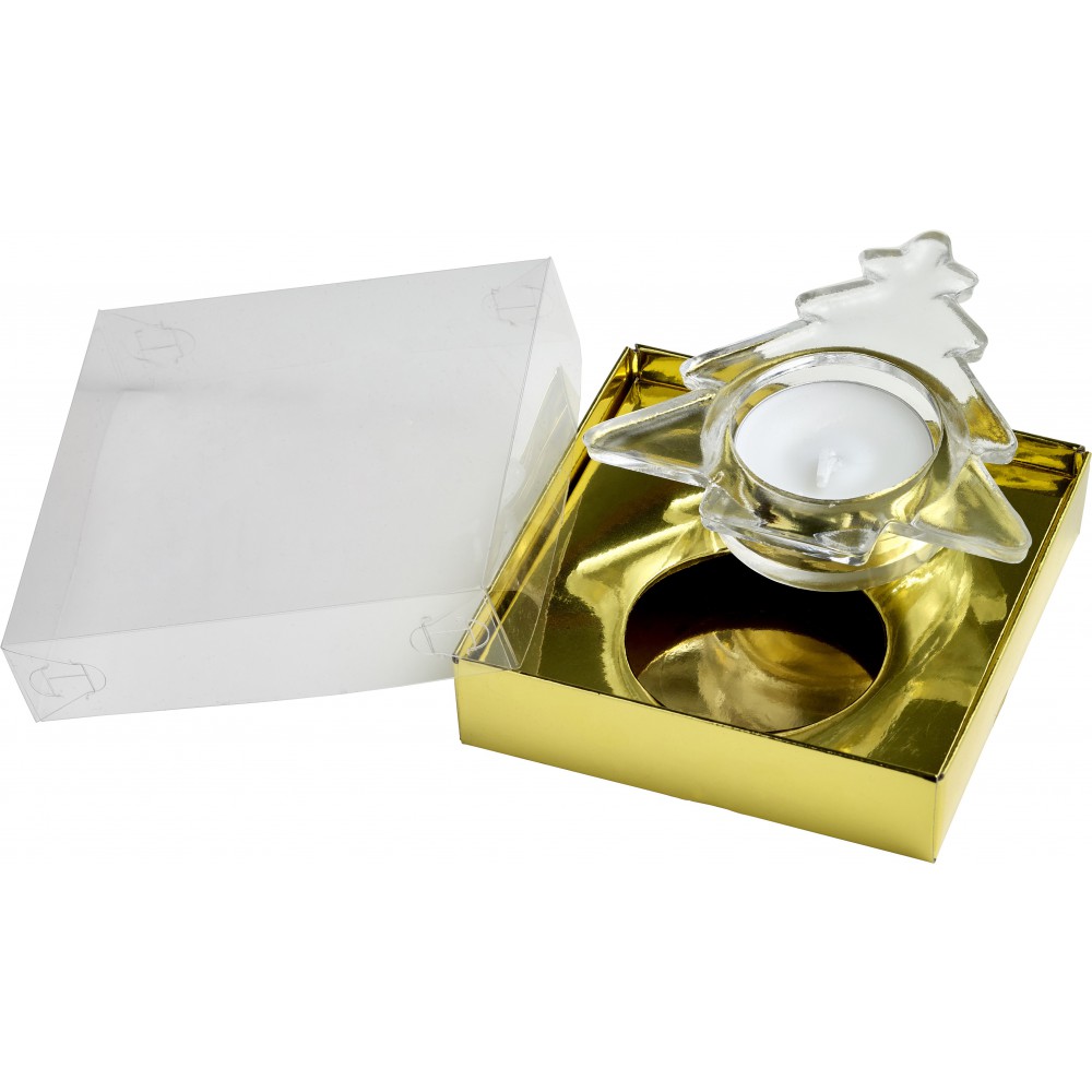 Fenyő alakú üveg gyertyatartó mécsessel. Csomagolása ajándékdoboz. Emblémázás: Matricázás
