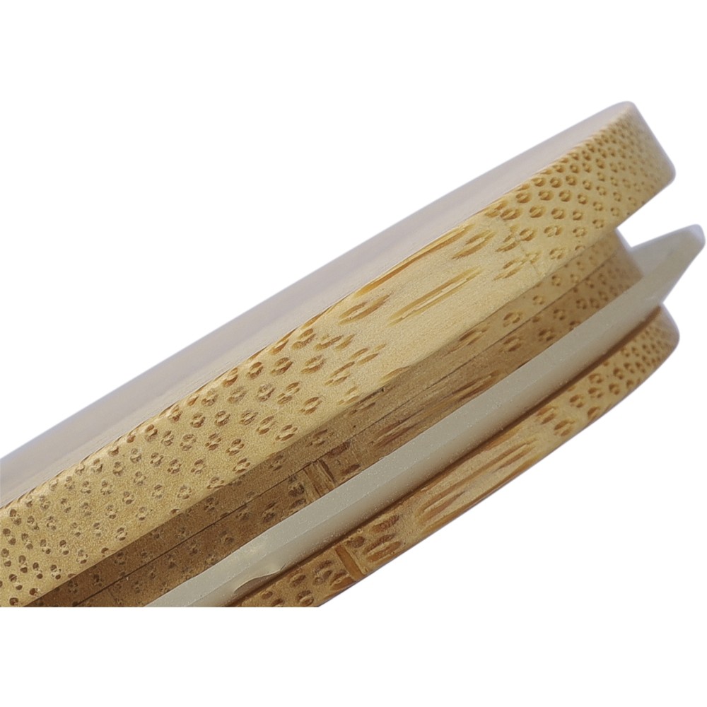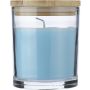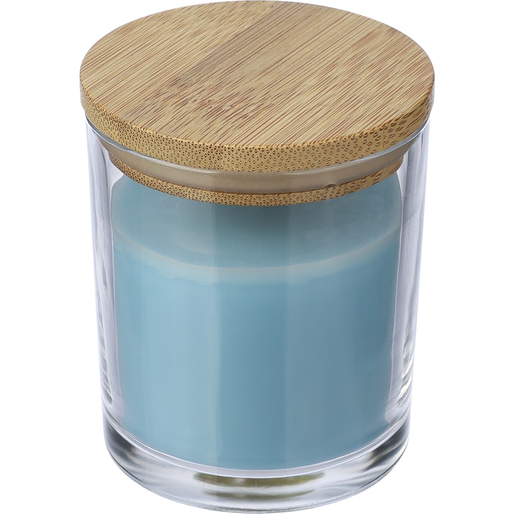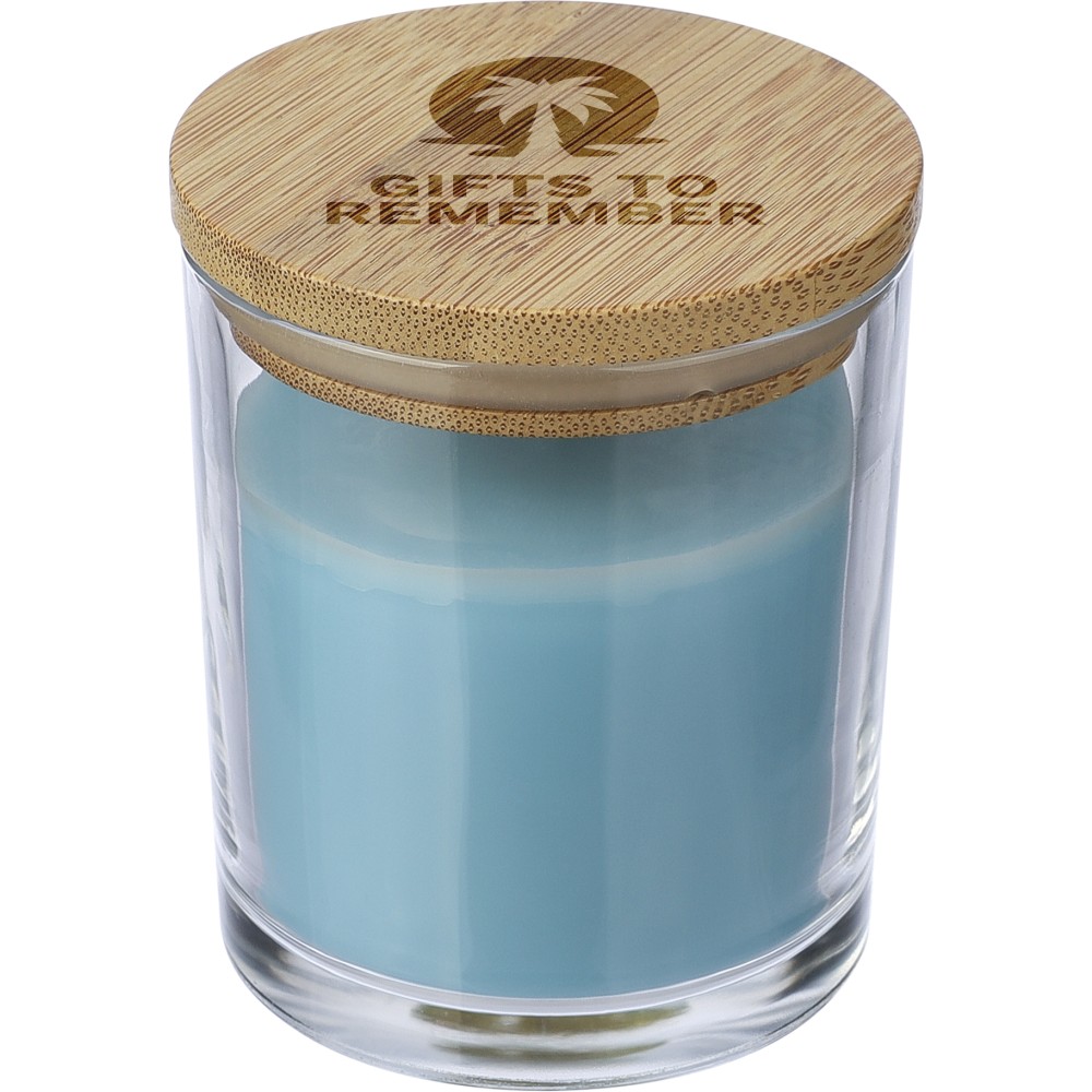 Üveg gyertyatartó 120 g vanília illatú, színes viasszal és bambusz fedéllel. Kb. 20 óra égési idővel. Csomagolása fehér papírhenger. Emblémázás: Gravírozás, Tamponnyomás