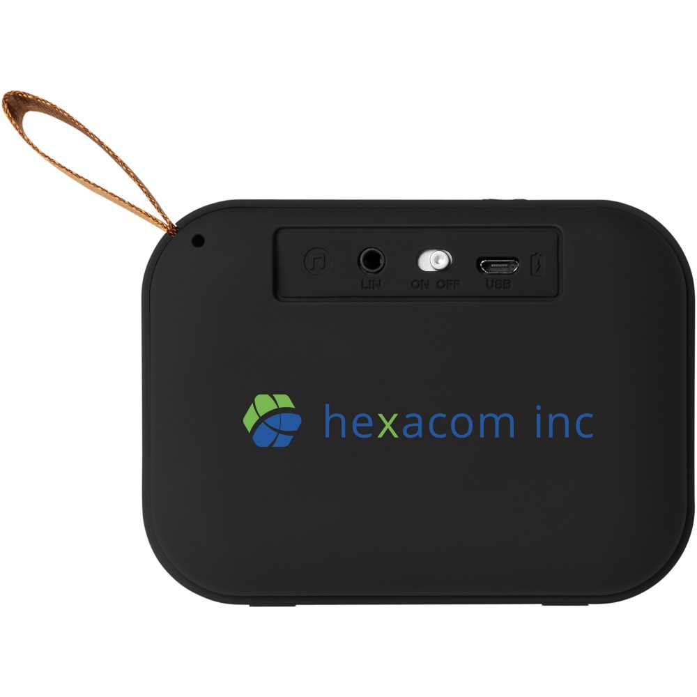 Textil bevonatú Bluetooth hangszóró megnyerő hanggal és stílussal. 3 Watt. A 400 mAh-ás akkumulátor 2 órás játszási időt tesz lehetővé. A Bluetooth hatótávolsága 10 méter (33ft). Bluetooth verzió 5.0. ABS műanyag. Emblémázás: Tamponnyomás