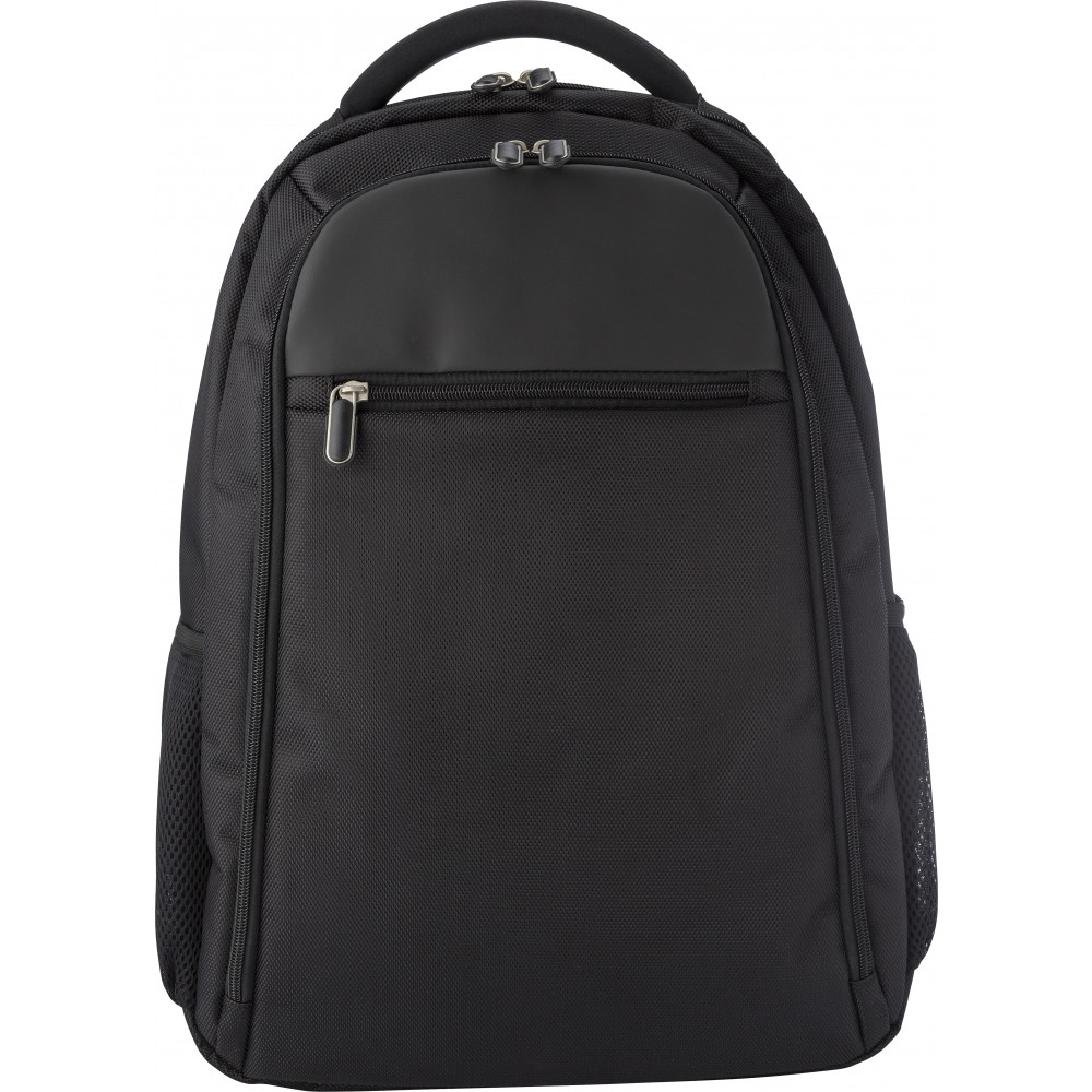 Laptophátizsák. Egy nagy párnázott rész, egy kisebb, cipzáros elsőzseb, két oldalzseb, állítható, párnázott vállpántok. 1680D poliészter. Emblémázás: Szitanyomás