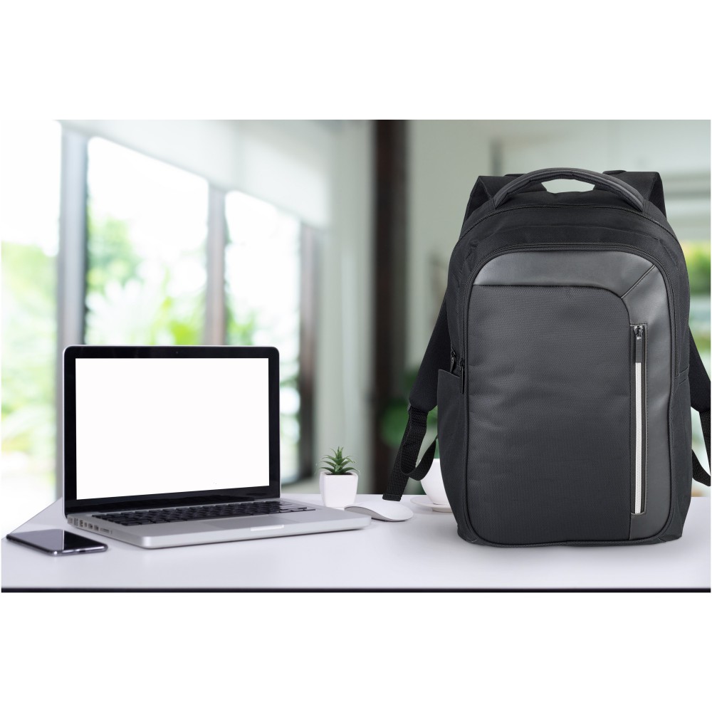 Elegáns, trendi, 15,6 -es laptop hátizsák nagy cipzáras, kulcstartós első zsebbel és rejtett RFID technológiájú blokkoló zsebbel a kártyák és okmányok adatlopás elleni védelme érdekében. A nagy, cipzáras fő tárolórész 15,6 -es laptop tárolására alkalmas, és elkölönített, párnázott résszel rendelkezik iPad vagy tablet számára. Az első, függőleges cipzár nyújt hozzáférést az első zsebhez. Két kiegészítő oldalzseb további tárolási lehetőséget biztosít, a párnázott, állítható vállpántok kényelmes viseletet nyújtanak, a hordozófül és a gurulós bőröndre húzható zseb lehetővé teszi a könnyű hordozást. Emblémázás: Szitanyomás