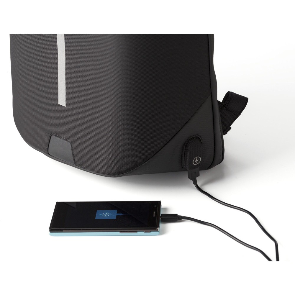 Hátizsák több belső zsebbel, párnázott rész a 15"-es laptop számára, párnázott, állítható vállpánt. 3 karakteres számkonbinációs lakat, fém fül, USB port és vezeték, fényvisszaverő csík, könnyített súlyeloszlást biztosító kialakítás. 1200D nylon anyag. Emblémázás: Szitanyomás