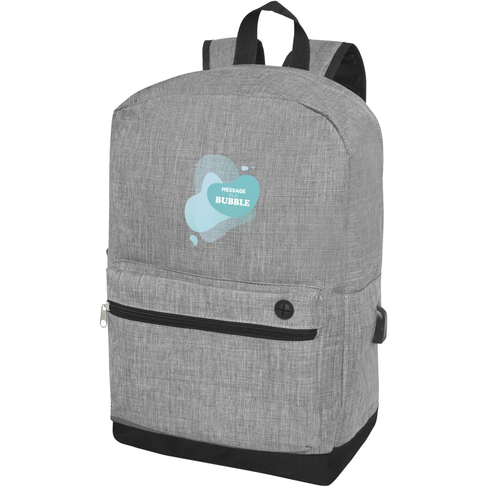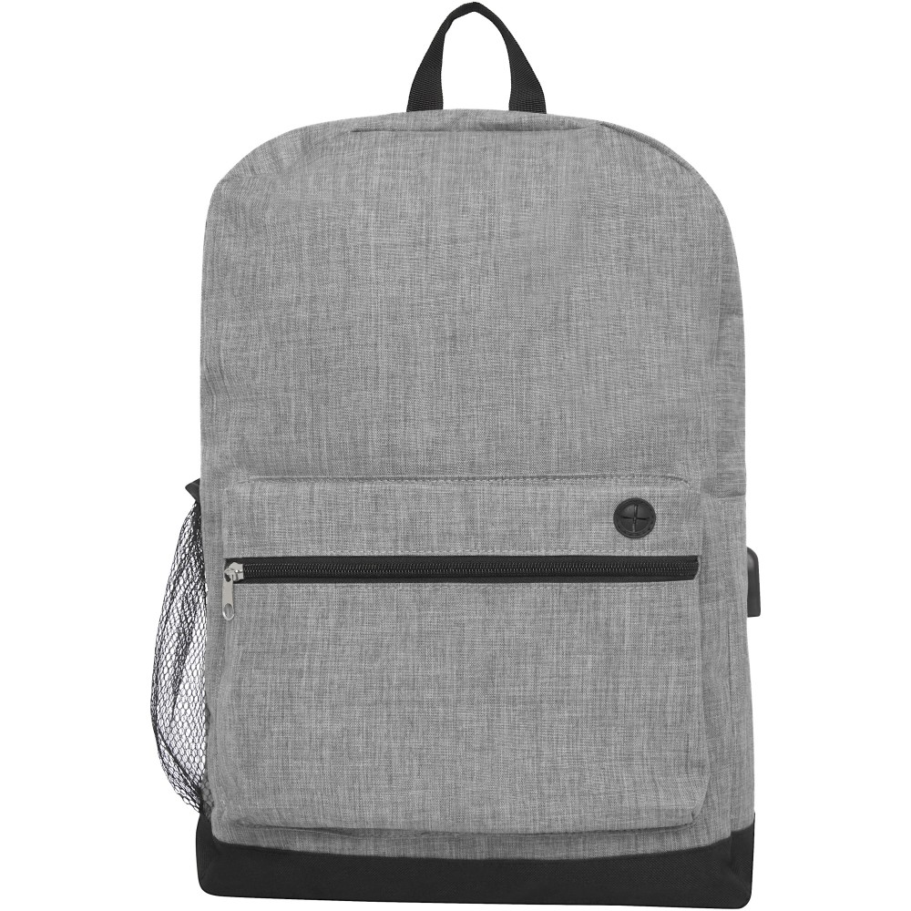 Laptop hátizsák nagy cipzáras fő rekesszel, párnázott 15,6 -os laptop tokkal és egy elülső cipzáras zsebbel, amely gyors hozzáférést biztosít a mobil eszközökhöz. USB-csatlakozóval rendelkezik, beleértve az USB-A kábelt 1 férfi és 1 női csatlakozóval. Kényelmes párnázott vállpántok, fogantyú, és egy hálós zseb palacknak. A tényleges termék színében kisebb eltérések lehetnek a szövetfestékek, szövések és a nyomtatás jellege miatt. 300D poliészter, 600D poliészter. Emblémázás: Szitanyomás