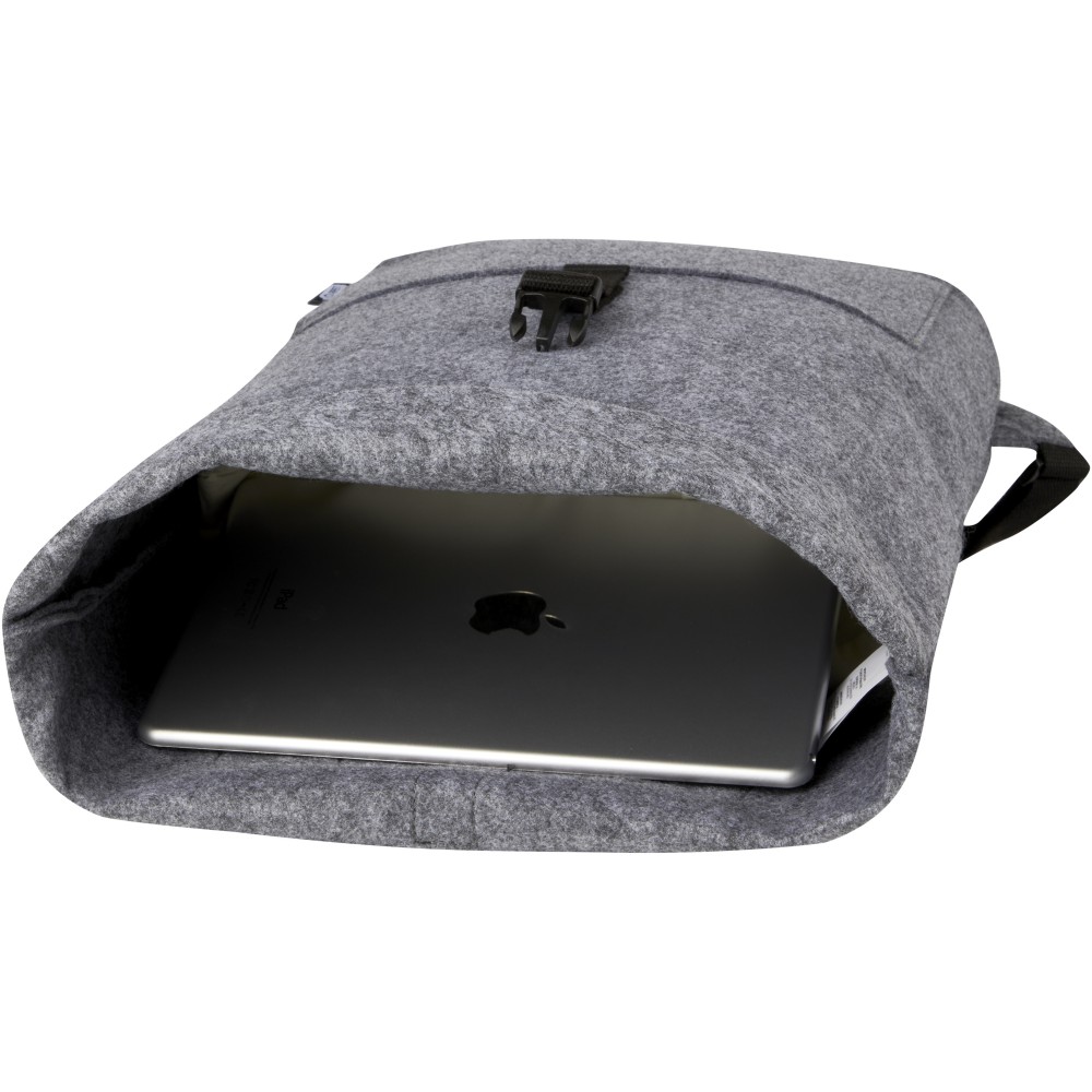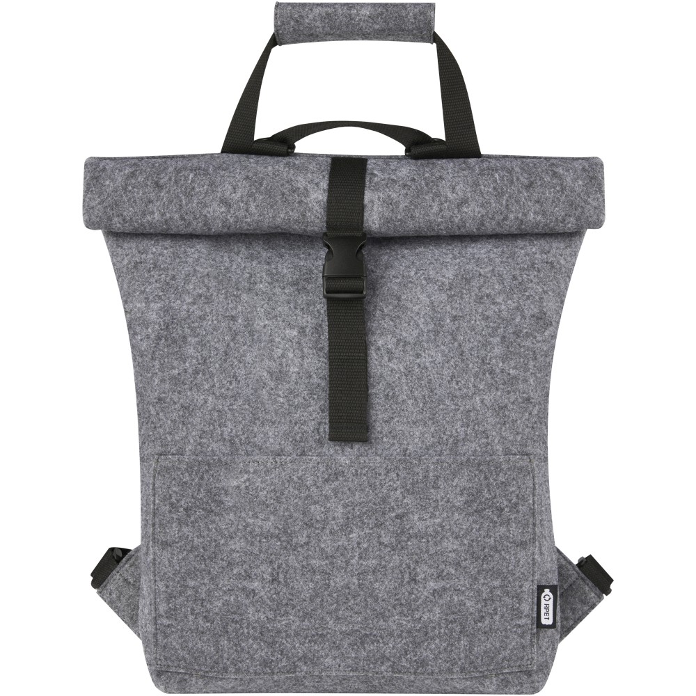 Többfunkciós és trendi kombinált roll-top hátizsák és kerékpártáska kiváló minőségű, puha és tartós GRS tanúsítvánnyal rendelkező újrahasznosított filcből. Nagy fő rekesszel, elülső zsebbel, állítható vállpántokkal és 3 akasztós pánttal, amellyel a táskát a kerékpár hátuljához rögzítheti. A vállpántok könnyen átalakíthatók hosszú füllé, vagy behajthatóak, így a hevederek nem akadnak be a kerékpár kerekébe. Emblémázás: Hímzés, Szitanyomás