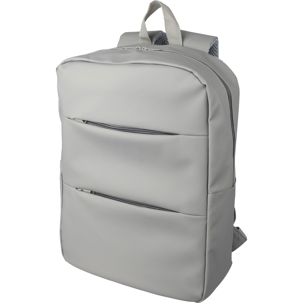 Laptop hátizsák 15 -es készülékhez. Két cipzáras elülső zsebbel, egy nagy cipzáras rekesszel és tépőzáras laptoprésszel, valamint több belső zsebbel. Szellőző, párnázott hátoldallal, trolifogantyúval és állítható vállpántokkal. Vízlepergető. Anyaga: PU. Emblémázás: Szitanyomás