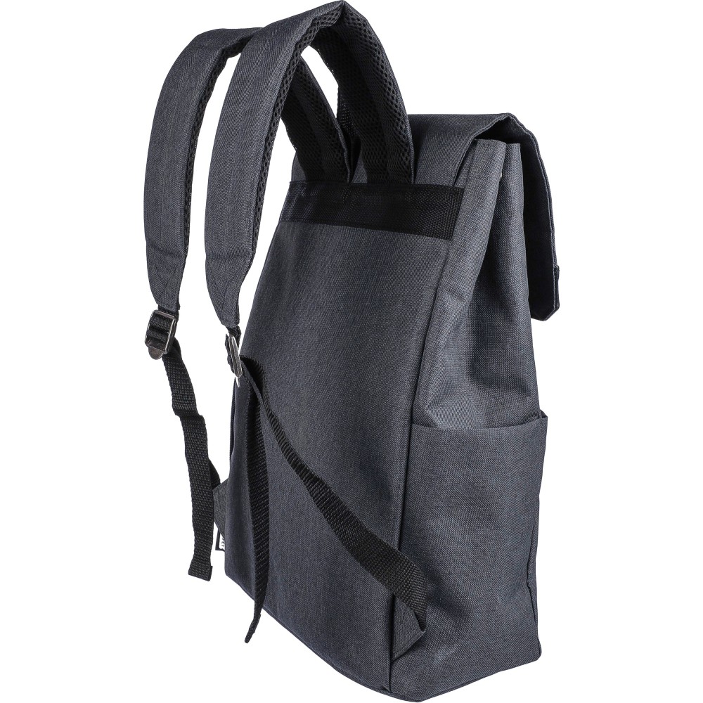 Laptophátizsák 15"-es laptop számára, PVC részletekkel és 210D béléssel. Kis cipzáras elülső zsebbel rendelkezik, benne egy kulcsokhoz rögzíthető karabinerrel, egy cipzáras oldalzsebbel, egy normál oldalzsebbel, valamint egy nagy, mágneszáras rekesszel, amely laptopzsebet tartalmaz. Oldalt nyomógombokkal zárható, ha nincs teljesen megtöltve. Állítható, szellőző pántokkal. Az elülső részen rPET anyagra utaló címke található. Anyaga: 600D poliészter vászon. Emblémázás: Szitanyomás