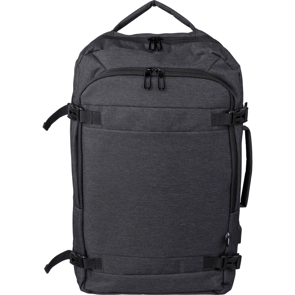 Hátizsák és laptoptáska 17"-es készülékhez. Kézipoggyász méretű. Hordozófüllel a tetején és oldalain. Tépőzáras laptop rekesszel, lopásgátló zsebbel és két nagy cipzáras rekesszel. Szellőző, párnázott hátoldallal, bőröndre húzható pánttal, zárócsatokkal és oldalsó USB-A porttal rendelkezik. Oldalsó csatok segítik a csomag kompakt tartását. Terhelhetősége kb. 12 kg. RPET alapanyagra utaló címke. Anyaga: 300D rPET poliészter. Emblémázás: Szitanyomás