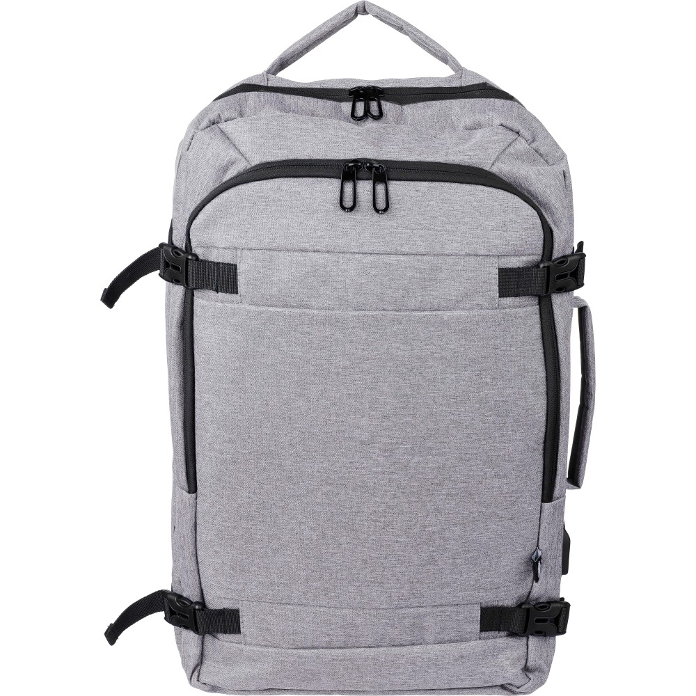 Hátizsák és laptoptáska 17"-es készülékhez. Kézipoggyász méretű. Hordozófüllel a tetején és oldalain. Tépőzáras laptop rekesszel, lopásgátló zsebbel és két nagy cipzáras rekesszel. Szellőző, párnázott hátoldallal, bőröndre húzható pánttal, zárócsatokkal és oldalsó USB-A porttal rendelkezik. Oldalsó csatok segítik a csomag kompakt tartását. Terhelhetősége kb. 12 kg. RPET alapanyagra utaló címke. Anyaga: 300D rPET poliészter. Emblémázás: Szitanyomás