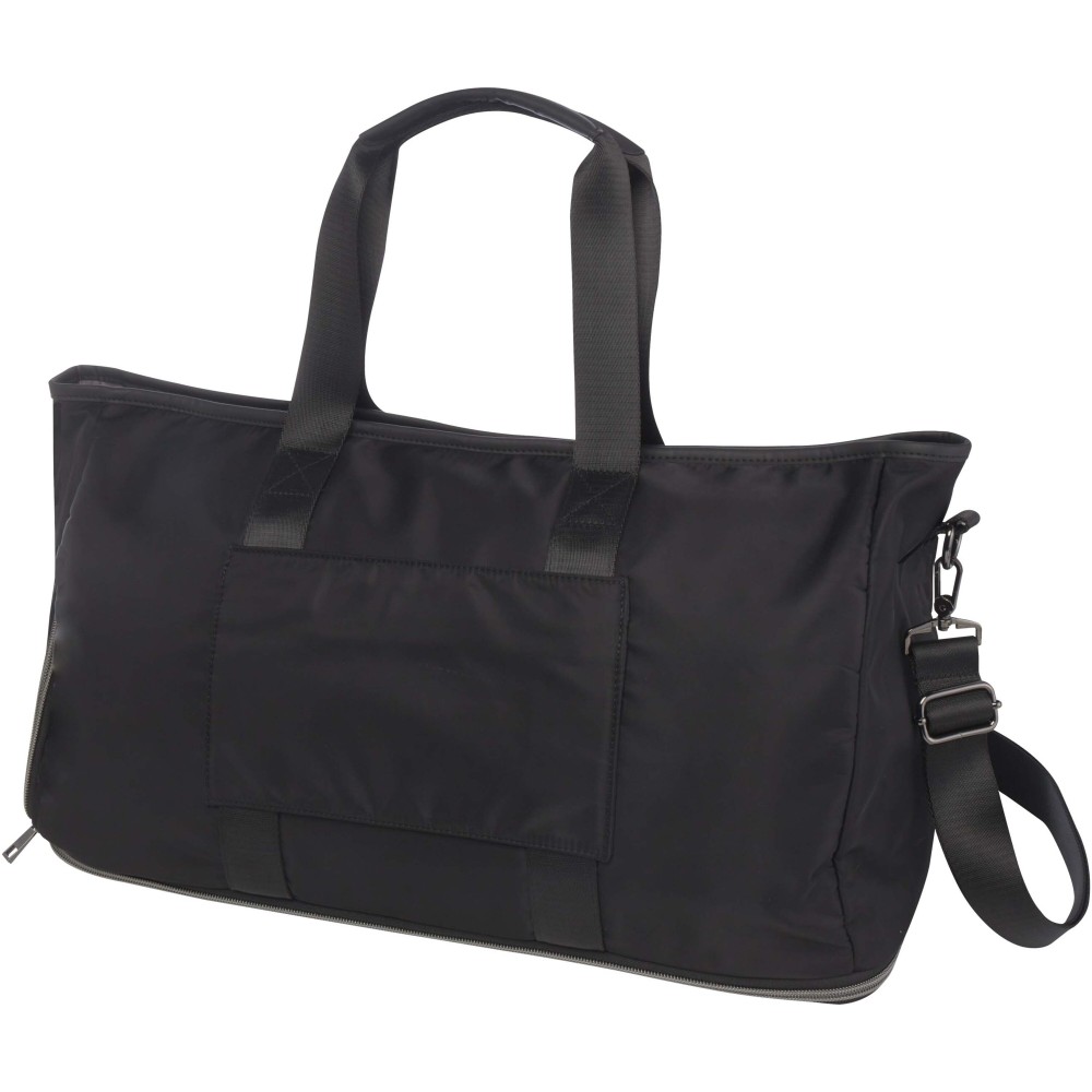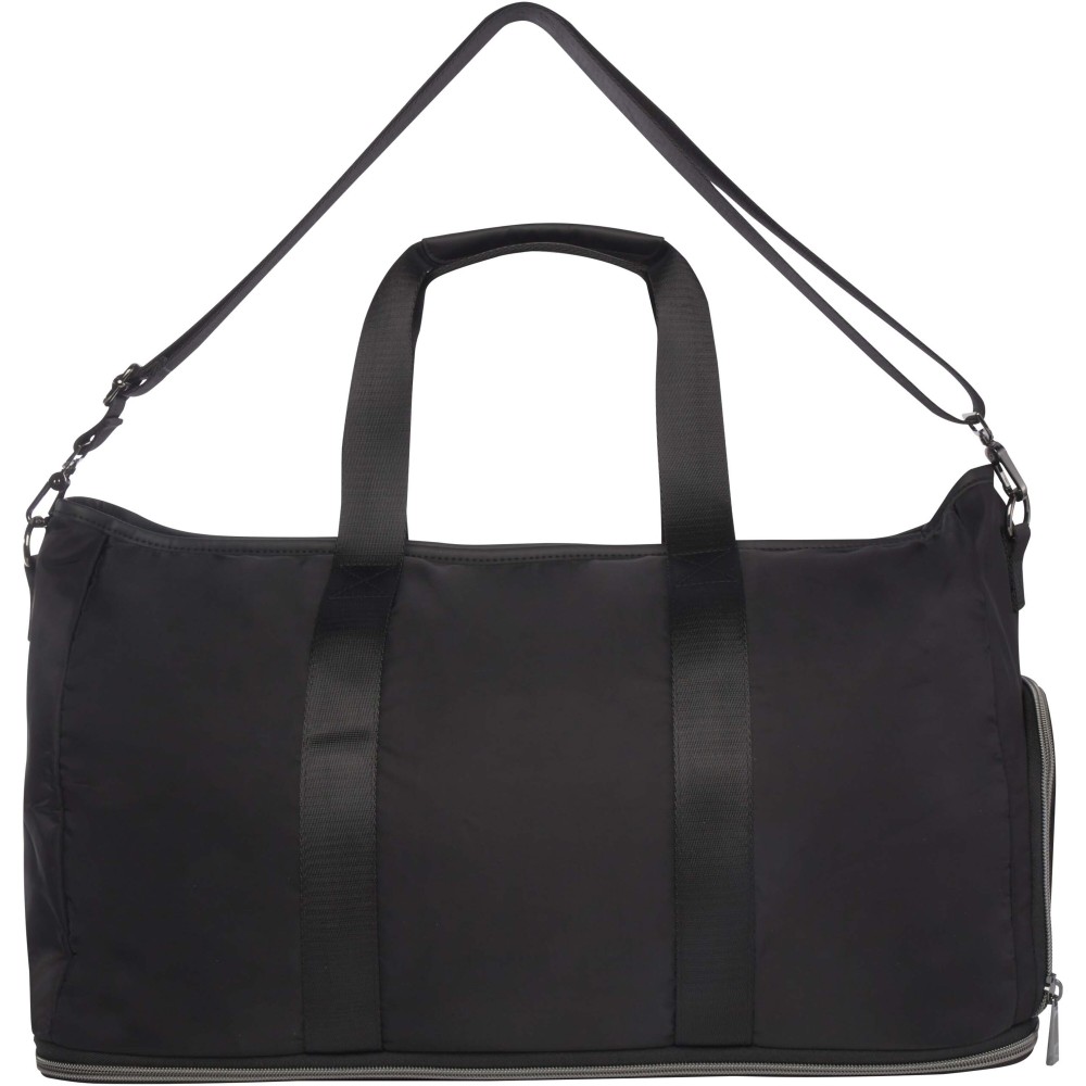 A Rhine bővíthető sporttáska stílusos kialakításával és sokoldalúságával tökéletes választás különféle alkalmakra. Kiváló minőségű, GRS tanúsítvánnyal rendelkező újrahasznosított nejlonból készült, puha RPET béléssel és prémium PU bőr elemekkel. A táska tágas főrekesszel rendelkezik, amely egy nagy, szivárgásmentes TPU zsebet, két nyitott zsebet és egy dedikált cipőtartó rekeszt tartalmaz. A hátoldalon található egy biztonságos rejtett zseb, amely egyben bőröndpántként is funkcionál. Az állítható, levehető vállpánt maximális kényelmet biztosít. A táska különlegessége a bővíthető réteg, amely akár 42 literes kapacitásra növelhető. Alap kapacitása 35 liter, maximális terhelhetősége 20 kg. PVC-mentes. Emblémázás: Szitanyomás