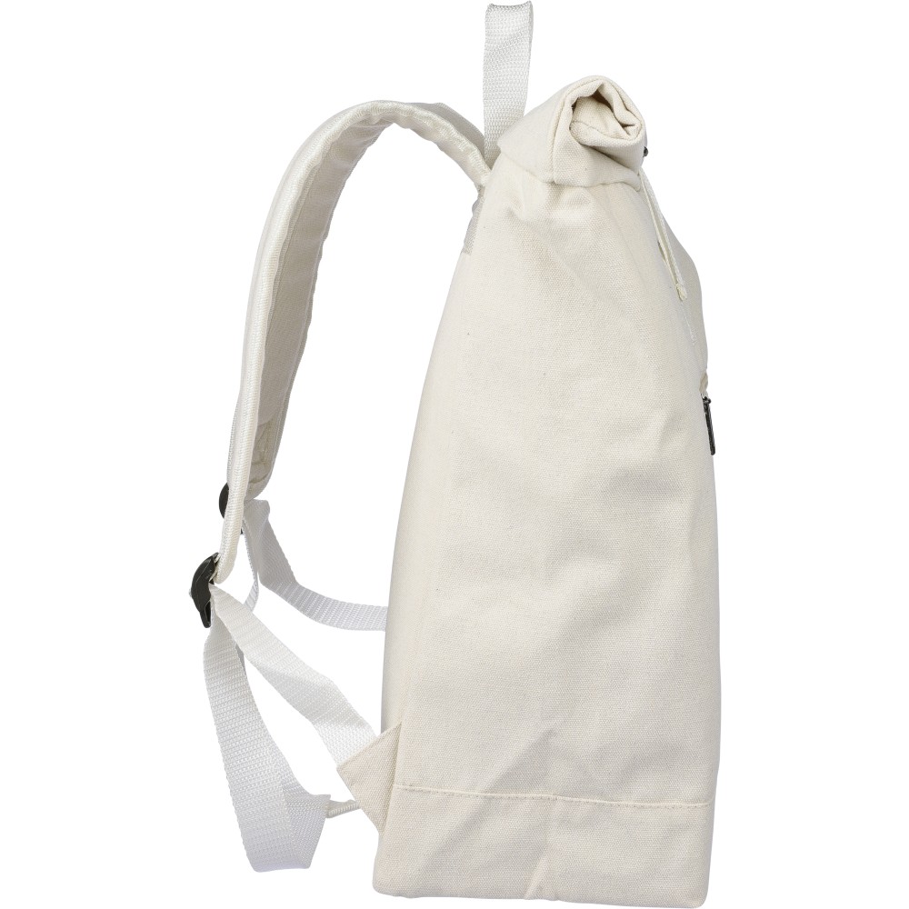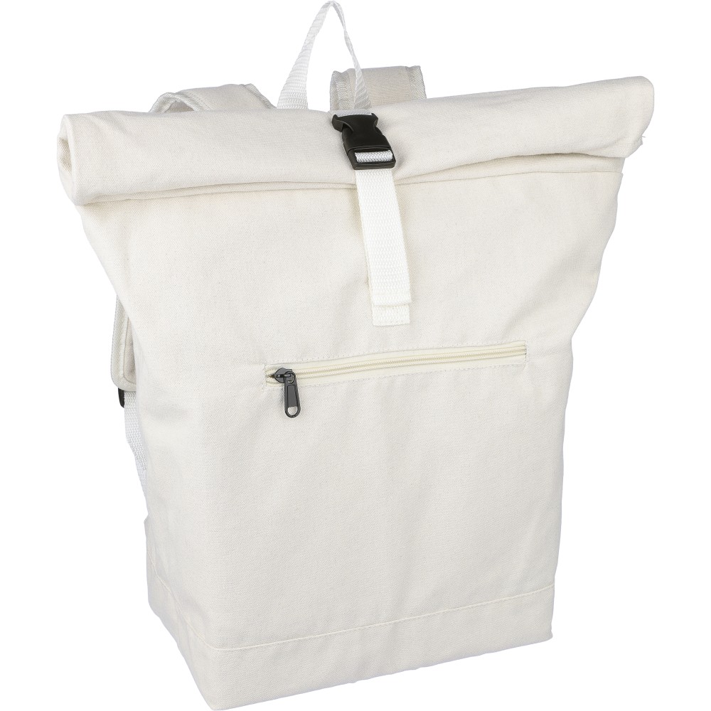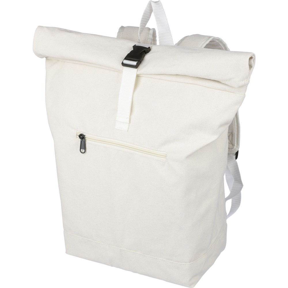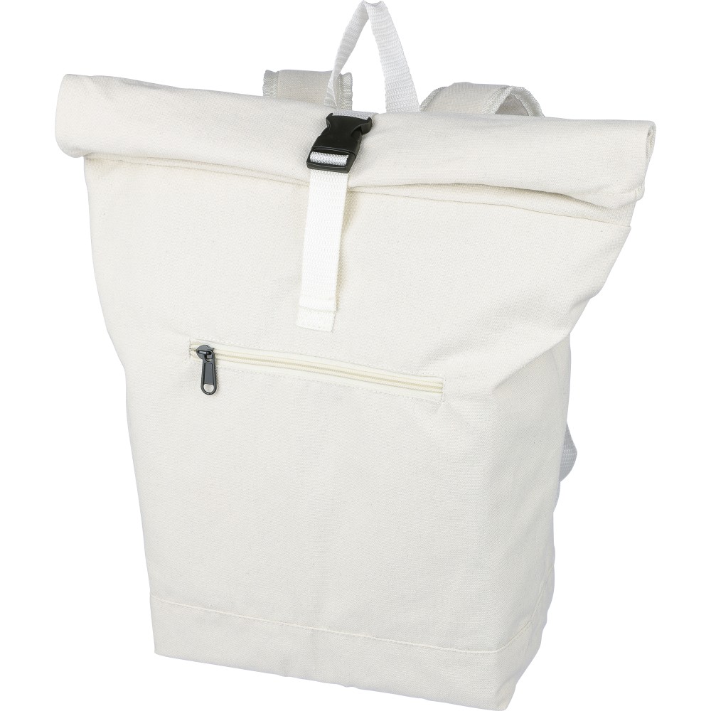 Rolltop hátizsák 330 g/m2 újahasznosított policotton anyagból, 210D poliészter béléssel és műanyag csattal. 15 literes űrtartalommal, egy nagy cipzáras rekesszel, 15"-es laptoptartó résszel, két belső és egy külső rekesszel. Tetején hordozófüllel, párnázott, állítható vállpánttal és egy kicsi, cipzáras elsőzsebbel. Teherbíró képessége 14 kg. Címkét tartalmaz. Emblémázás: Szitanyomás