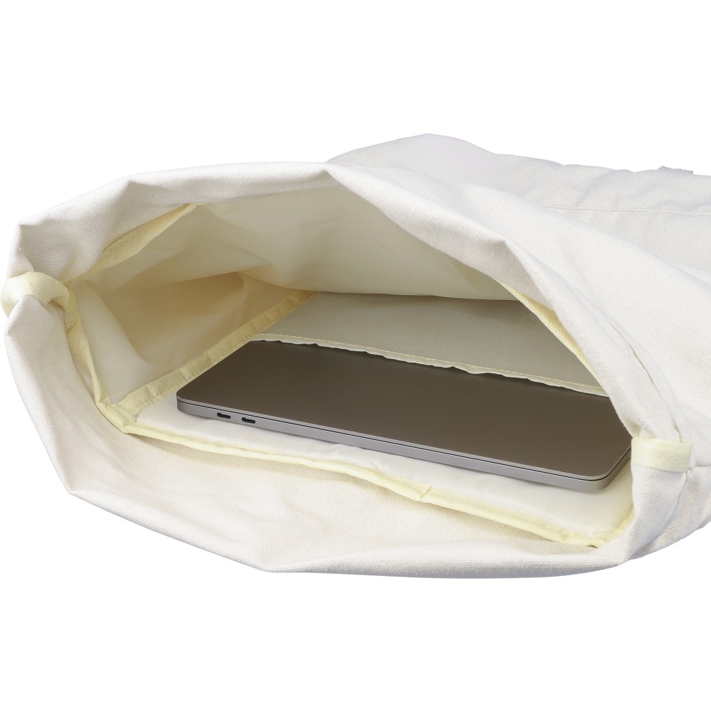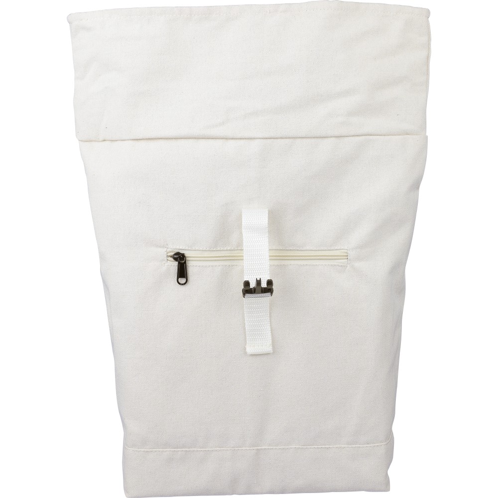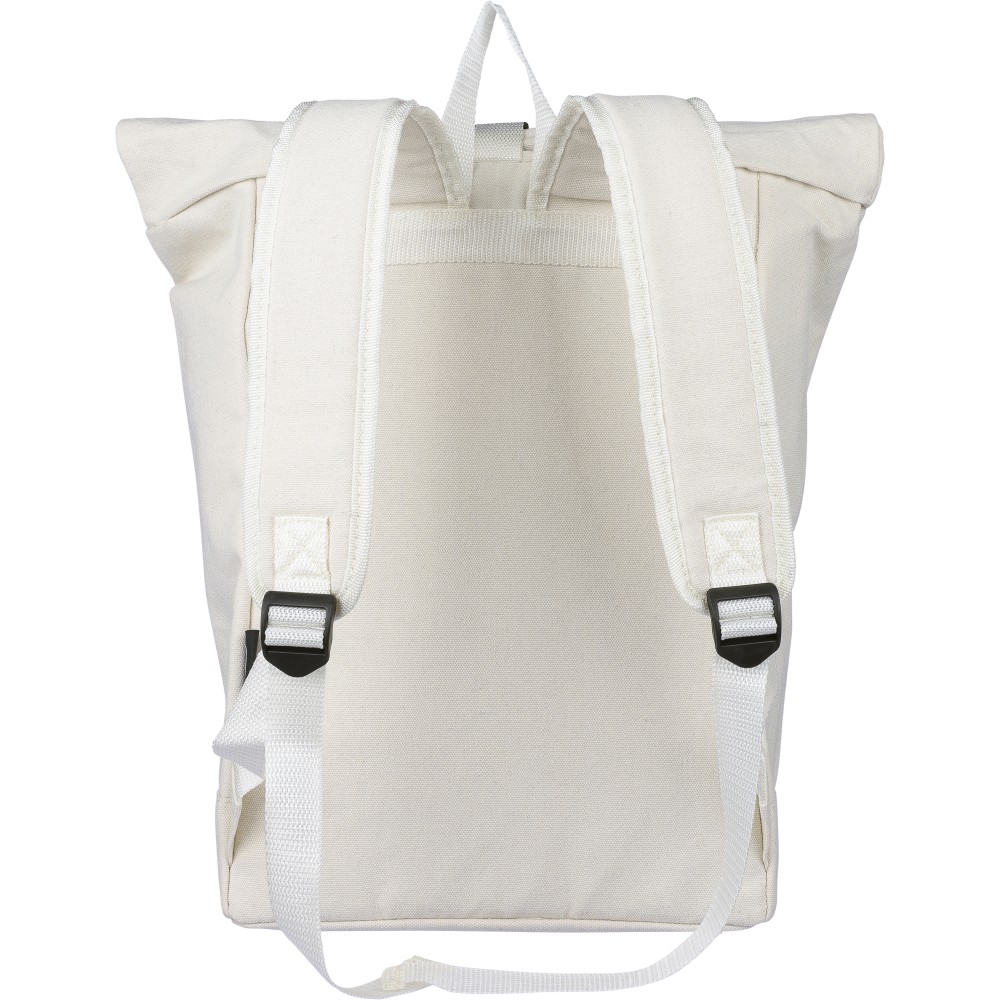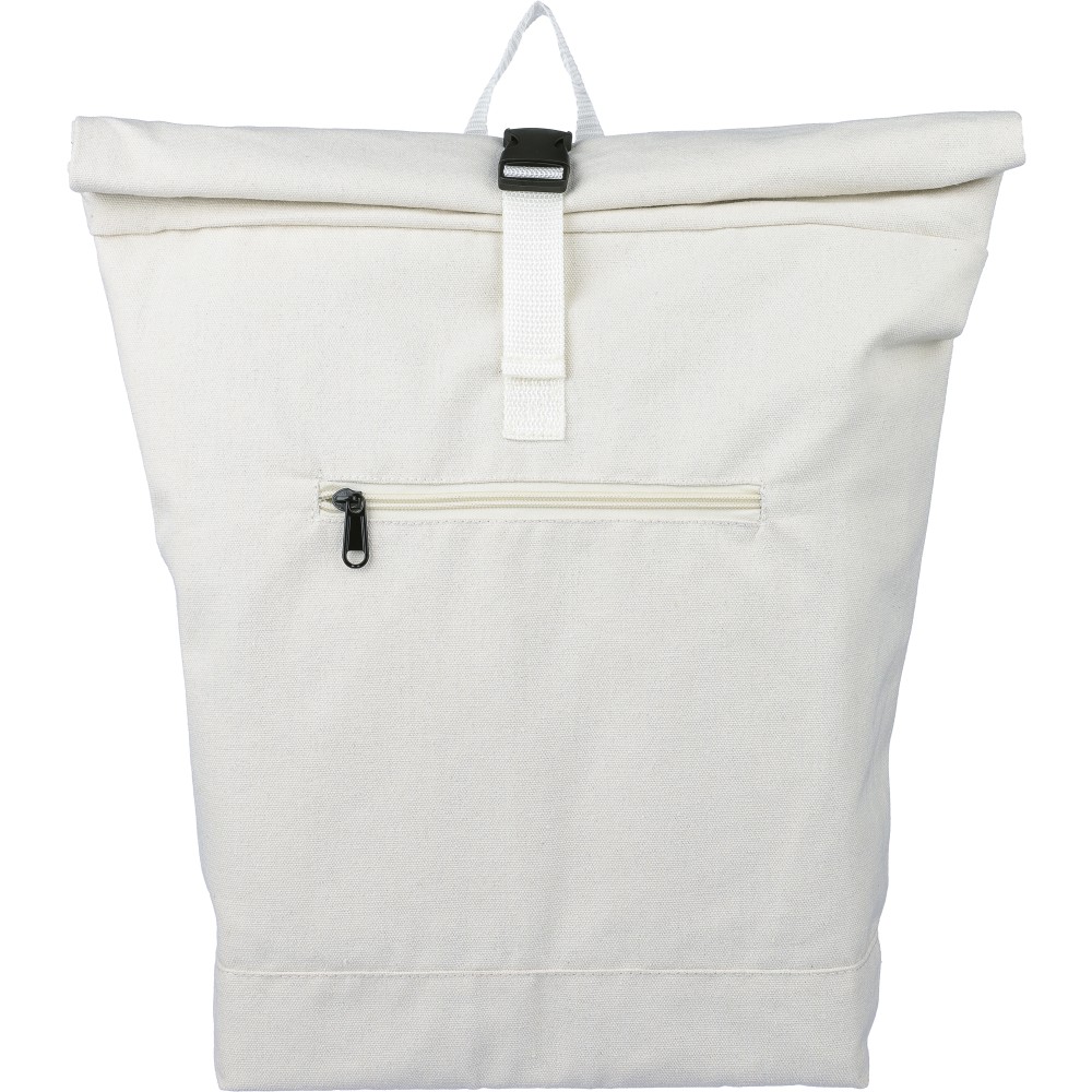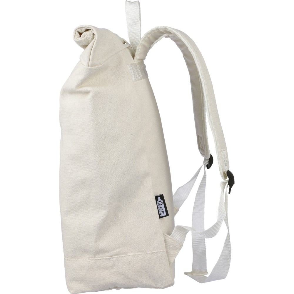 Rolltop hátizsák 330 g/m2 újahasznosított policotton anyagból, 210D poliészter béléssel és műanyag csattal. 15 literes űrtartalommal, egy nagy cipzáras rekesszel, 15"-es laptoptartó résszel, két belső és egy külső rekesszel. Tetején hordozófüllel, párnázott, állítható vállpánttal és egy kicsi, cipzáras elsőzsebbel. Teherbíró képessége 14 kg. Címkét tartalmaz. Emblémázás: Szitanyomás