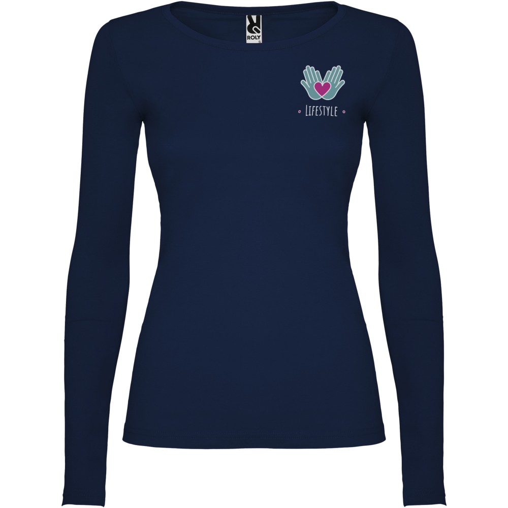 Hosszúujjú, oldalvarott, enyhén karcsúsított női póló 4 rétegű, kerek, keskeny nyakkal. Nincs ujj- és aljpasszé. Megerősített nyaki varrások. A férfi modell körkötött, a gyermek és női modell oldalvarrott. Szürke szín: 85% pamut és 15% viszkóz, 160 g/m2. Egyéb színek: 100% pamut, 160 g/m2. Emblémázás: Hímzés, Szitanyomás