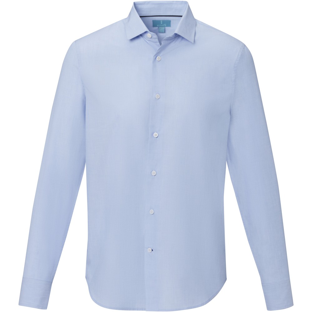 Férfi hosszúujjú ing. Fenntartható promóciós ruházat. Gravírozott gyöngyházfényű gombok. Állítható mandzsetta egy hajtással. Szatén szegés a belső nyakon. Kontrasztos színű varrások az ujjakon és az alsó gomblyukon. Szőtt címke. Poplin 100% minősített biopamutból, 121 g/m2. Emblémázás: Hímzés
