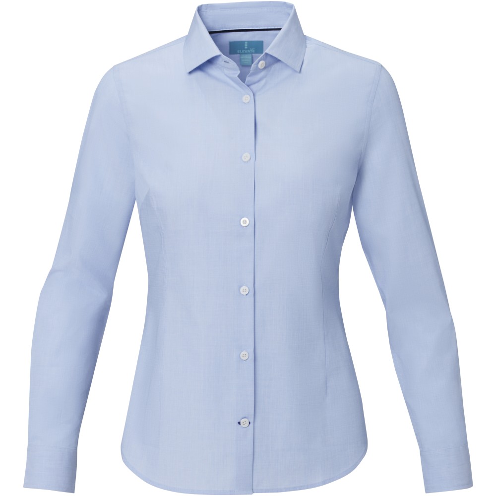 Női hosszúujjú blúz. Fenntartható promóciós ruházat. Gravírozott gyöngyházfényű gombok. Állítható mandzsetta egy hajtással. Szatén szegés a belső nyakon. Kontrasztos színű varrások az ujjakon és az alsó gomblyukon. Szőtt címke. Poplin 100% minősített biopamutból, 121 g/m2. Emblémázás: Hímzés