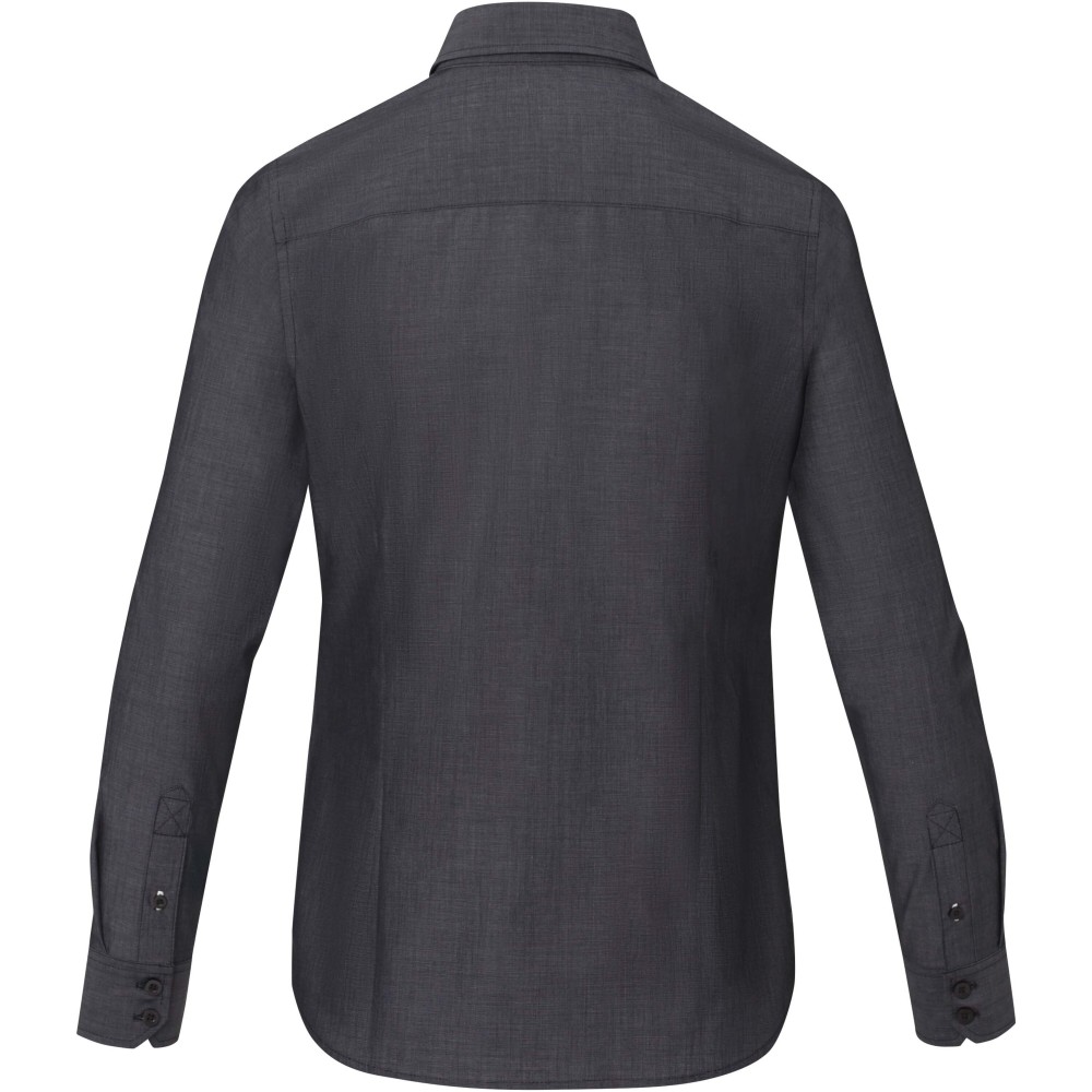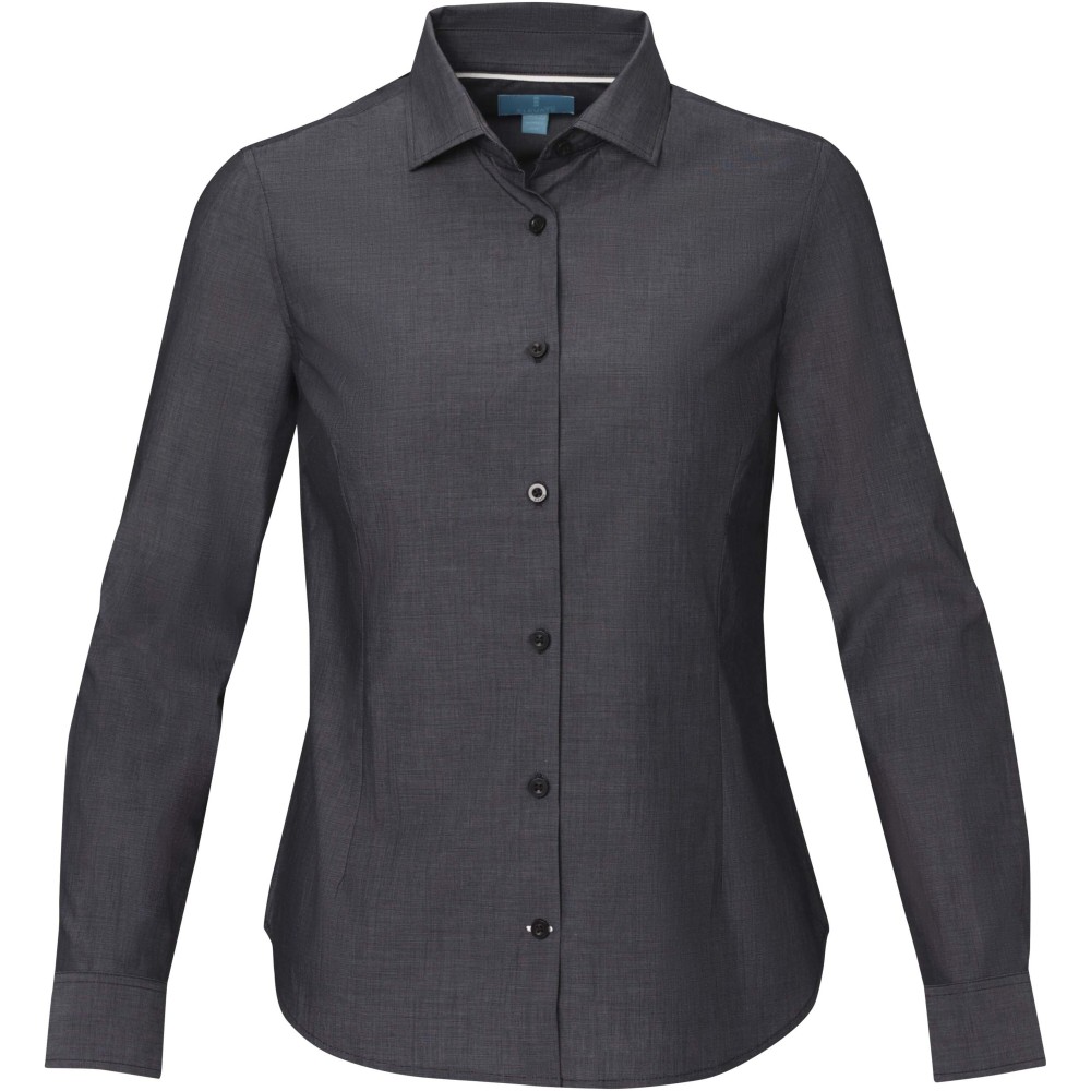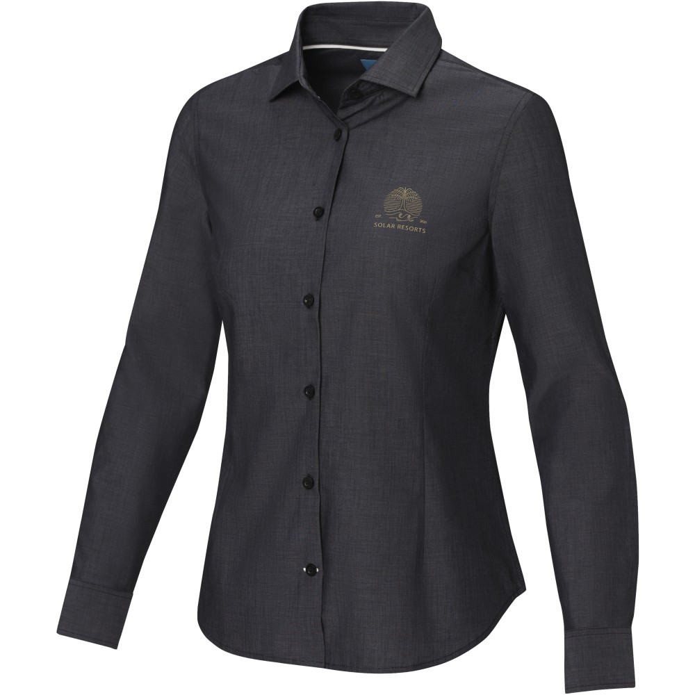 Női hosszúujjú blúz. Fenntartható promóciós ruházat. Gravírozott gyöngyházfényű gombok. Állítható mandzsetta egy hajtással. Szatén szegés a belső nyakon. Kontrasztos színű varrások az ujjakon és az alsó gomblyukon. Szőtt címke. Poplin 100% minősített biopamutból, 121 g/m2. Emblémázás: Hímzés