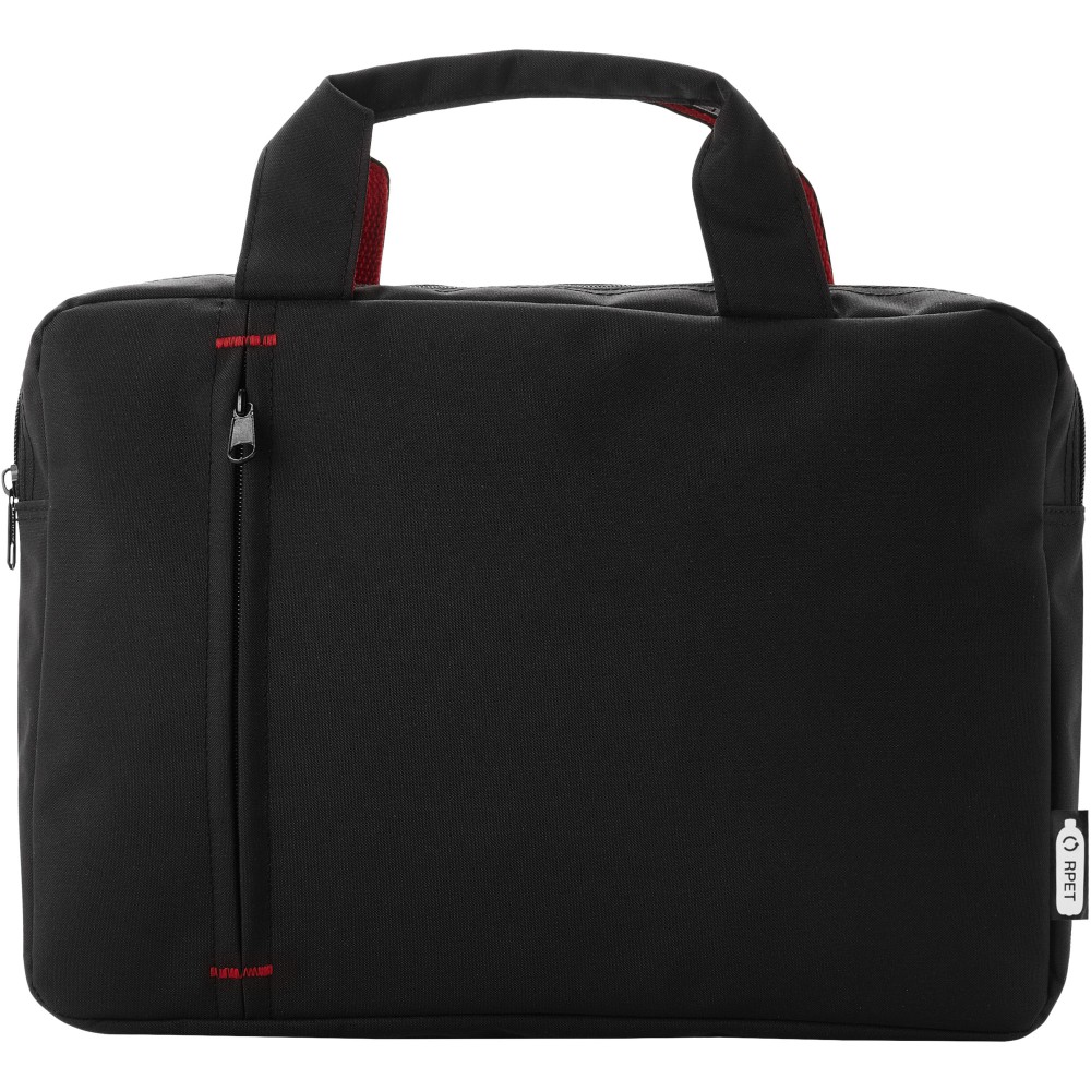 Újrahasznosított PET műanyagból készült konferenciatáska cipzáras fő rekesszel és elülső cipzáras zsebbel, megerősített felső fogantyúkkal és divatos színű kontrasztelemekkel. Emblémázás: Szitanyomás