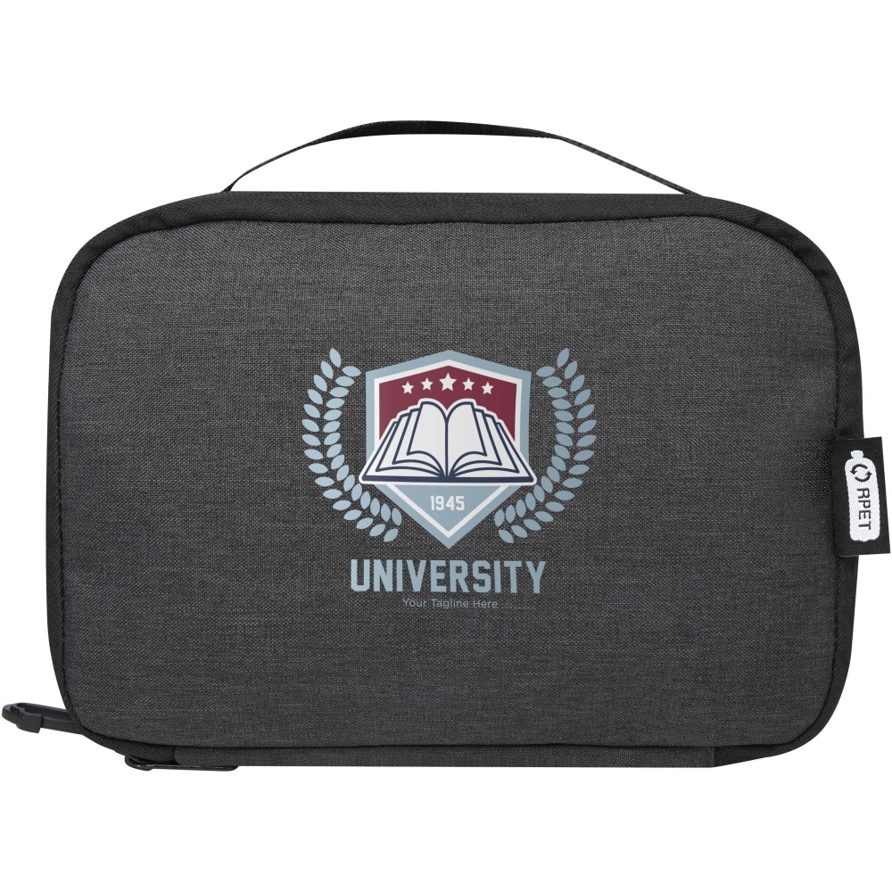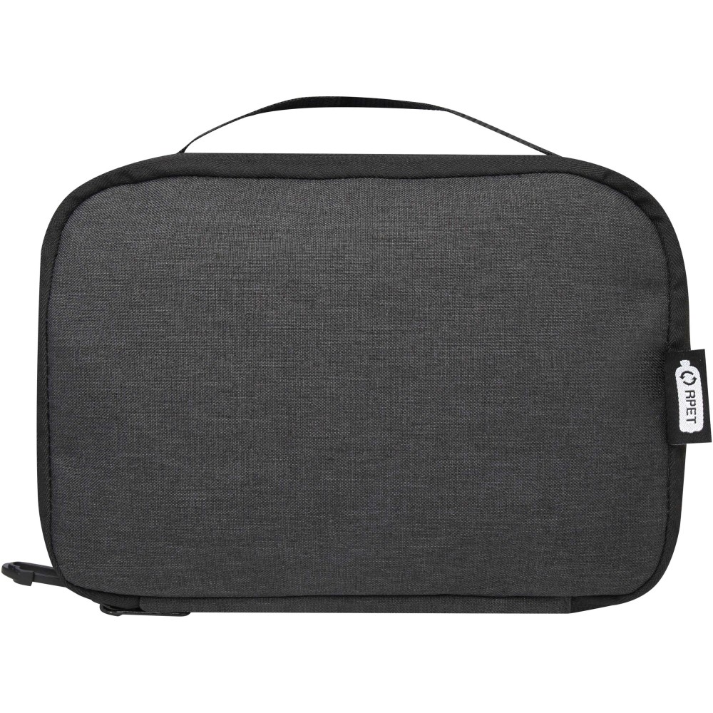 A Ross GRS újrahasznosított tech-táska ideális az állandóan úton lévők számára, és rendezetten tarthatja a powerbankokat, töltőkábeleket vagy bármilyen más elektronikus kiegészítőt. Több zsebbel, elasztikus hurokkal és egy kábelátvezető résszel rendelkezik, amely lehetővé teszi a powerbank tárolását, miközben a telefont tölti. Egy műanyag karabinerrel is rendelkezik egy másik táskához való rögzítéshez. Űrtartalom: 1 liter. Emblémázás: Szitanyomás