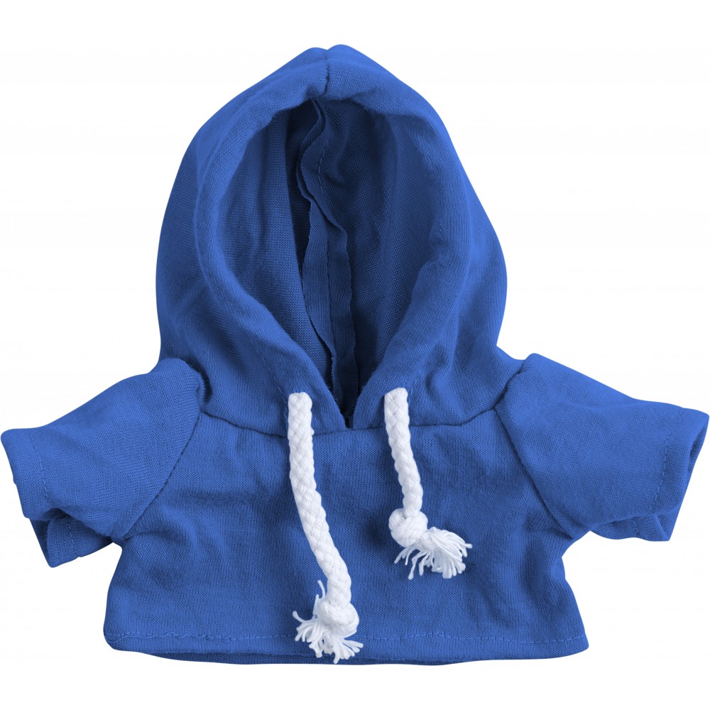 Plüssmackó színes kapucnis pólóban, fehér húzózsinórral. Szeme hímzett. Emblémázás: Szitanyomás
