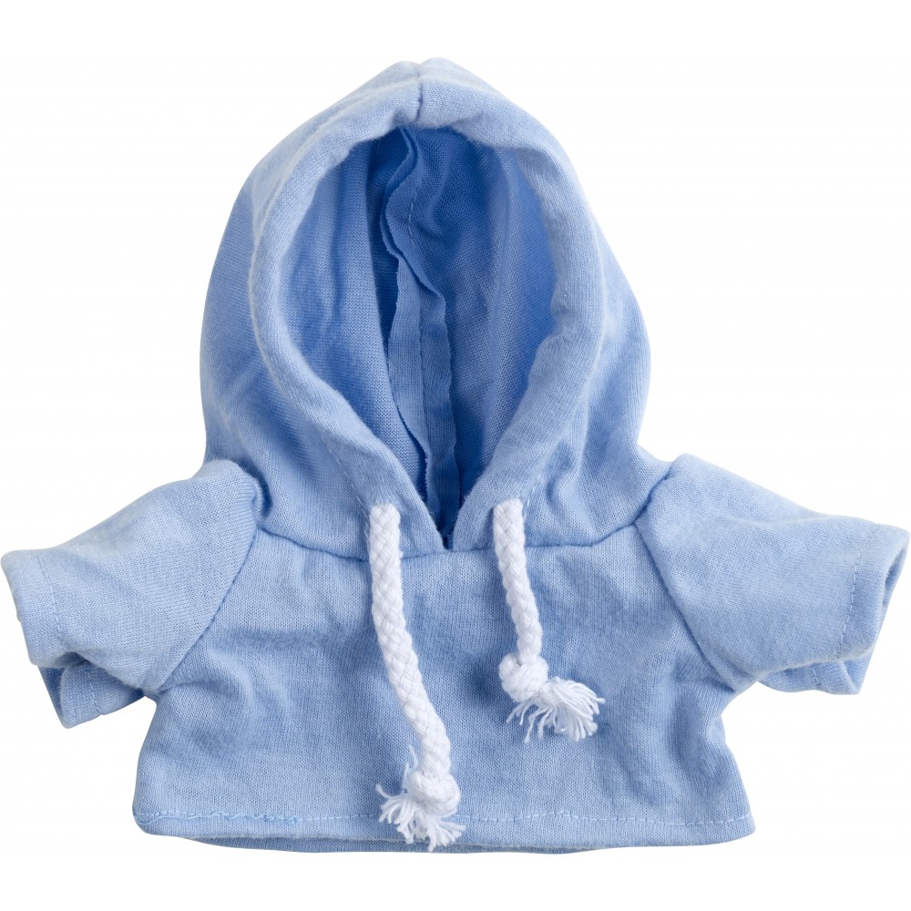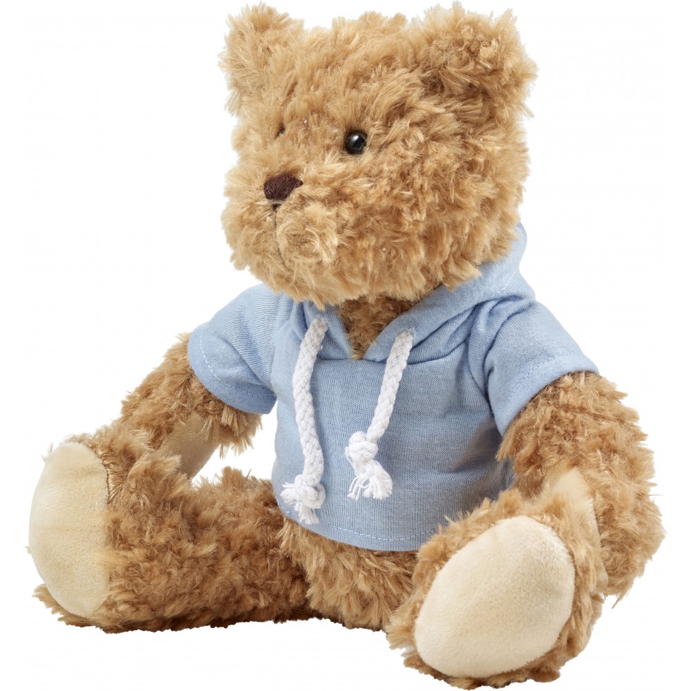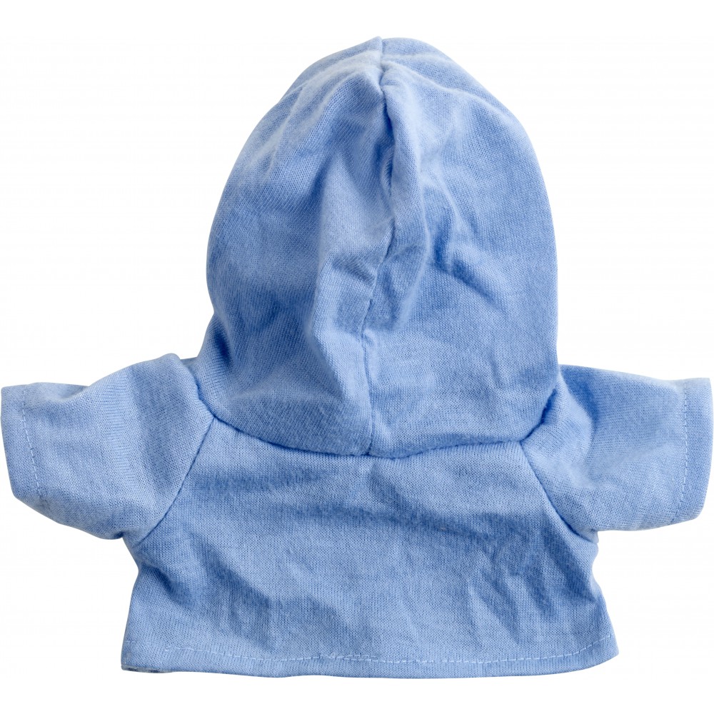 Plüssmackó színes kapucnis pólóban, fehér húzózsinórral. Szeme hímzett. Emblémázás: Szitanyomás