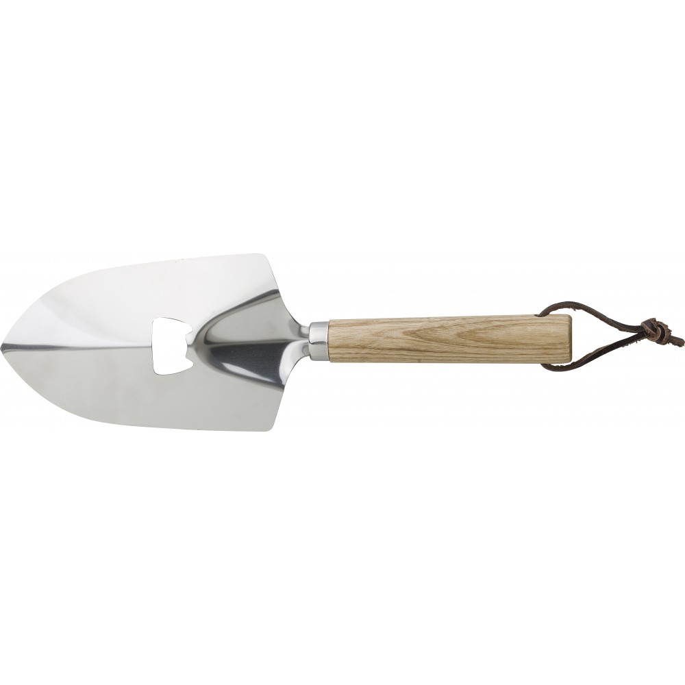Kertészlapát fa nyéllel, üvegnyitó funkcióval. Csomagolása barna papírdoboz. Emblémázás: Gravírozás, Tamponnyomás