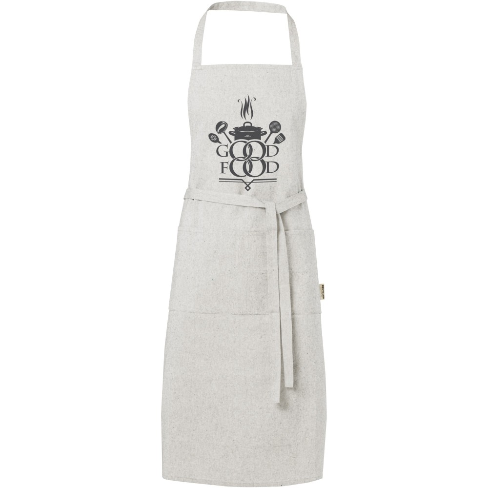 Kötény 200 g/m2-es újrahasznosított pamut és poliészter keverékből. Két 45 x 20 cm-es kombinált zsebbel és egy 1 méteres megkötővel. Az újrahasznosított pamutot a textilgyárakban a vágási folyamat során keletkezett hulladékból állítják elő. Az újrahasznosított pamut természetéből adódóan csekély színeltérés előfordulhat. A nyakpánt hossza: 55 cm. Emblémázás: Hímzés, Szitanyomás