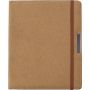 A4-es méretű parafa mappa gumis zárópánttal, PU belsővel, kicsi hálós névjegytartó zsebbel, egy nagyobb zsebbel, 20 lapos jegyzettömbbel és tolltartó füllel (a tollat nem tartalmazza). Emblémázás: Gravírozás, Szitanyomás, Tamponnyomás