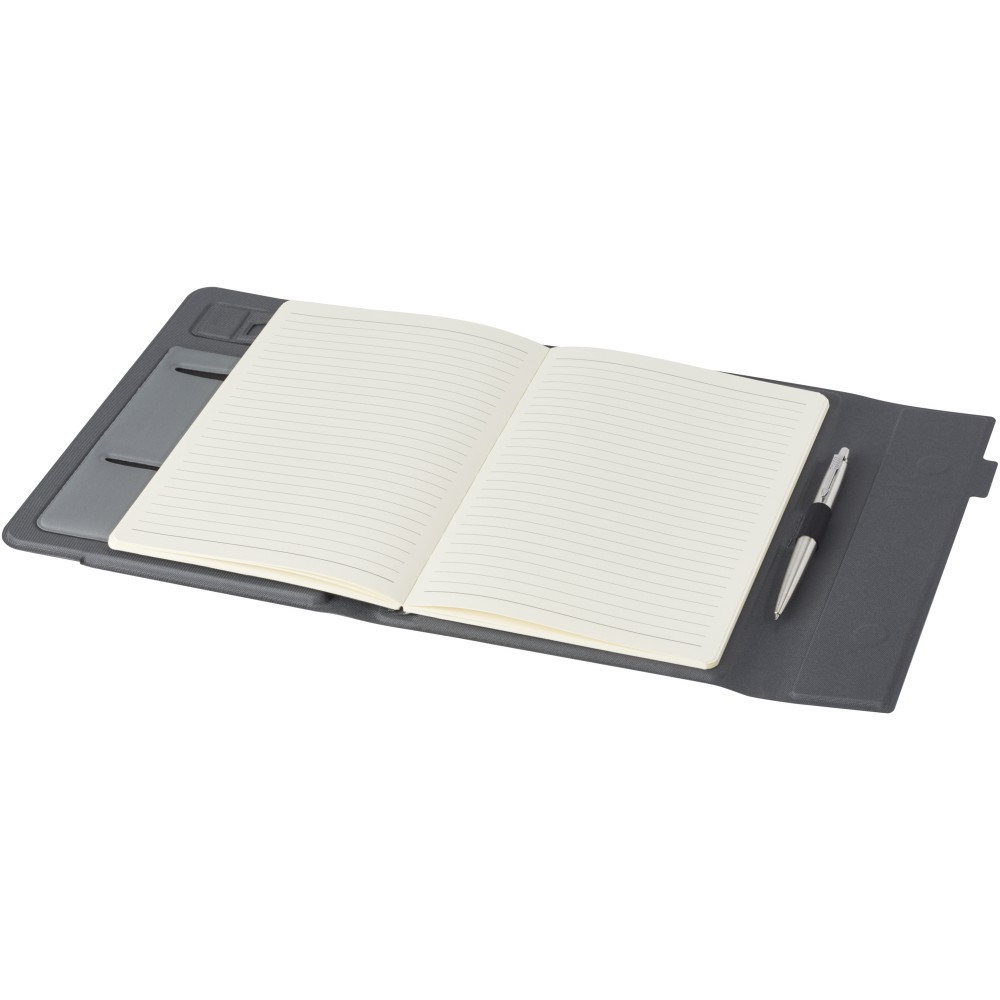 Az RCS tanúsítvánnyal rendelkező Liberto padfólió részben újrahasznosított poliészterből készül, így ez a padfólió fenntarthatóbb választás, mivel segít csökkenteni az új nyersanyag felhasználását. Tollhurokkal, harmonikazsebbel és 64 krémszínű, vonalas, fenntartható forrásból származó, 80 g/m2-es, újrahasznosított lappal rendelkezik. A képeken látható toll és egyéb kiegészítők nem tartoznak a termékhez. Emblémázás: Tamponnyomás