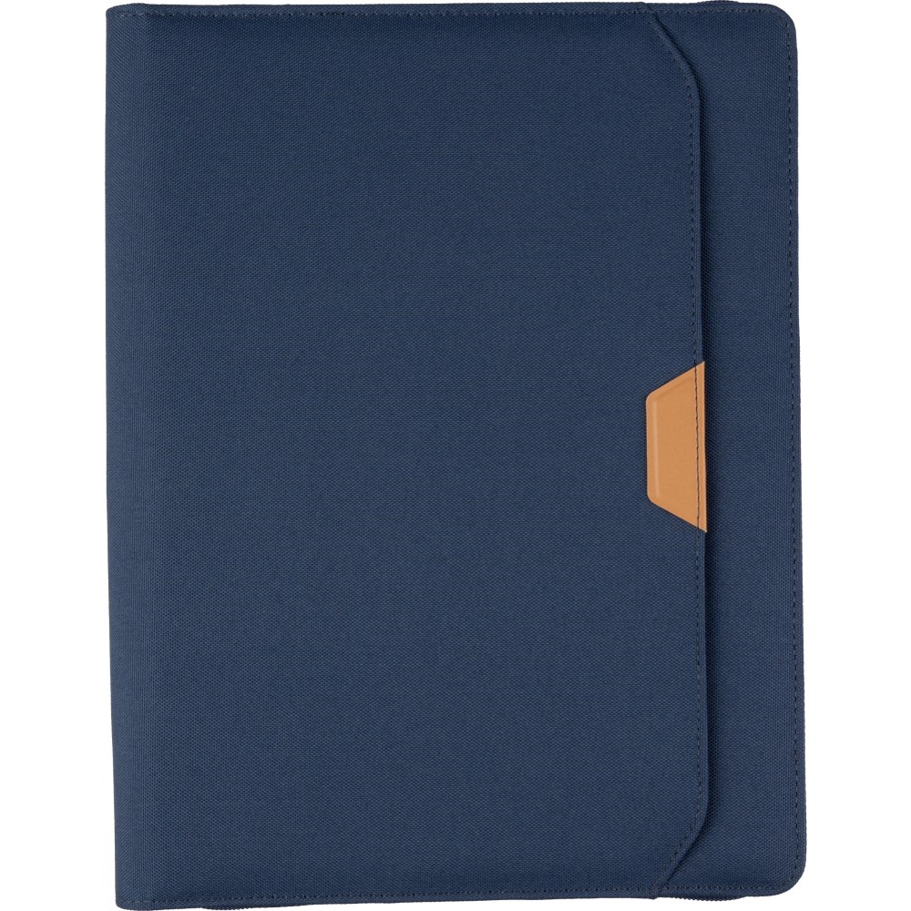 RPET mappa kb. A4-es méretben, cipzárral, több rekesszel és egy tollhurokkal. Tartalmaz egy jegyzettömböt 20 vonalas lappal. Kis zseb az elején. Egyedi csomagolás barna kraft dobozban. Emblémázás: Tamponnyomás
