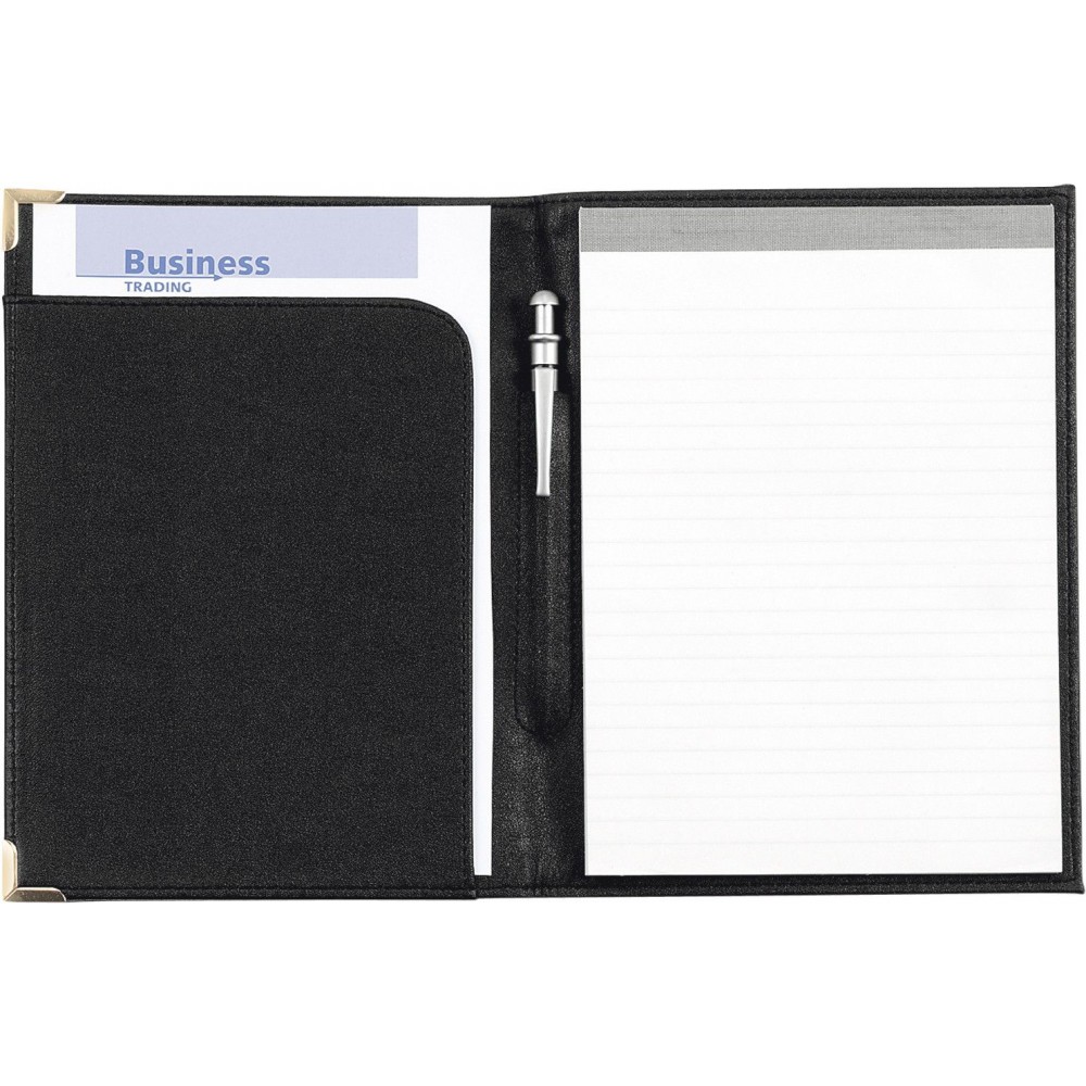 A5-ös PU mappa fém sarokkal. Jegyzettömböt nem tartalmaz. 30 vagy 50 lapos jegyzettömb fehér lapokkal a 23023 vagy 23026 cikkszámon külön rendelhető. A fekete mappa arany színű sarkokkal, a kék mappa ezüst színű sarkokkal érkezik. Emblémázás: Szitanyomás, Tamponnyomás