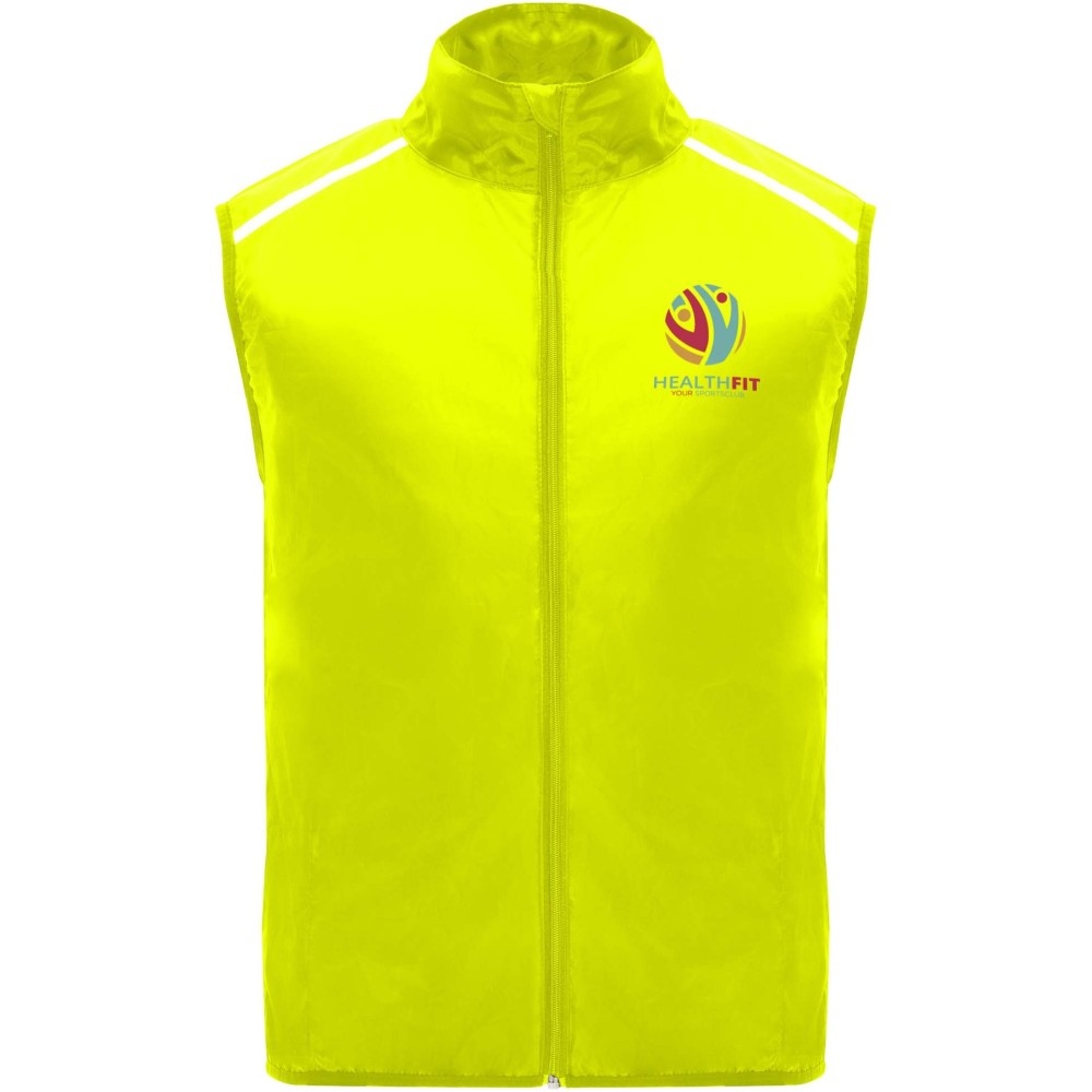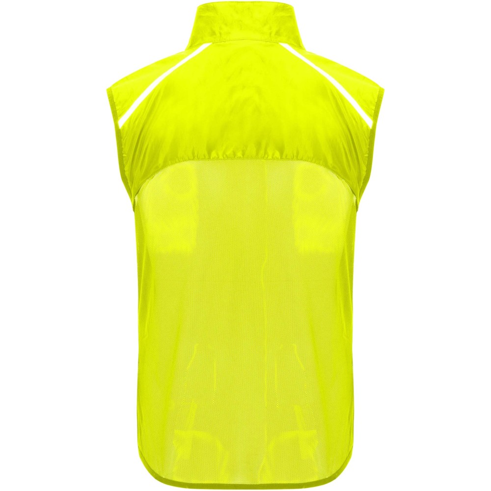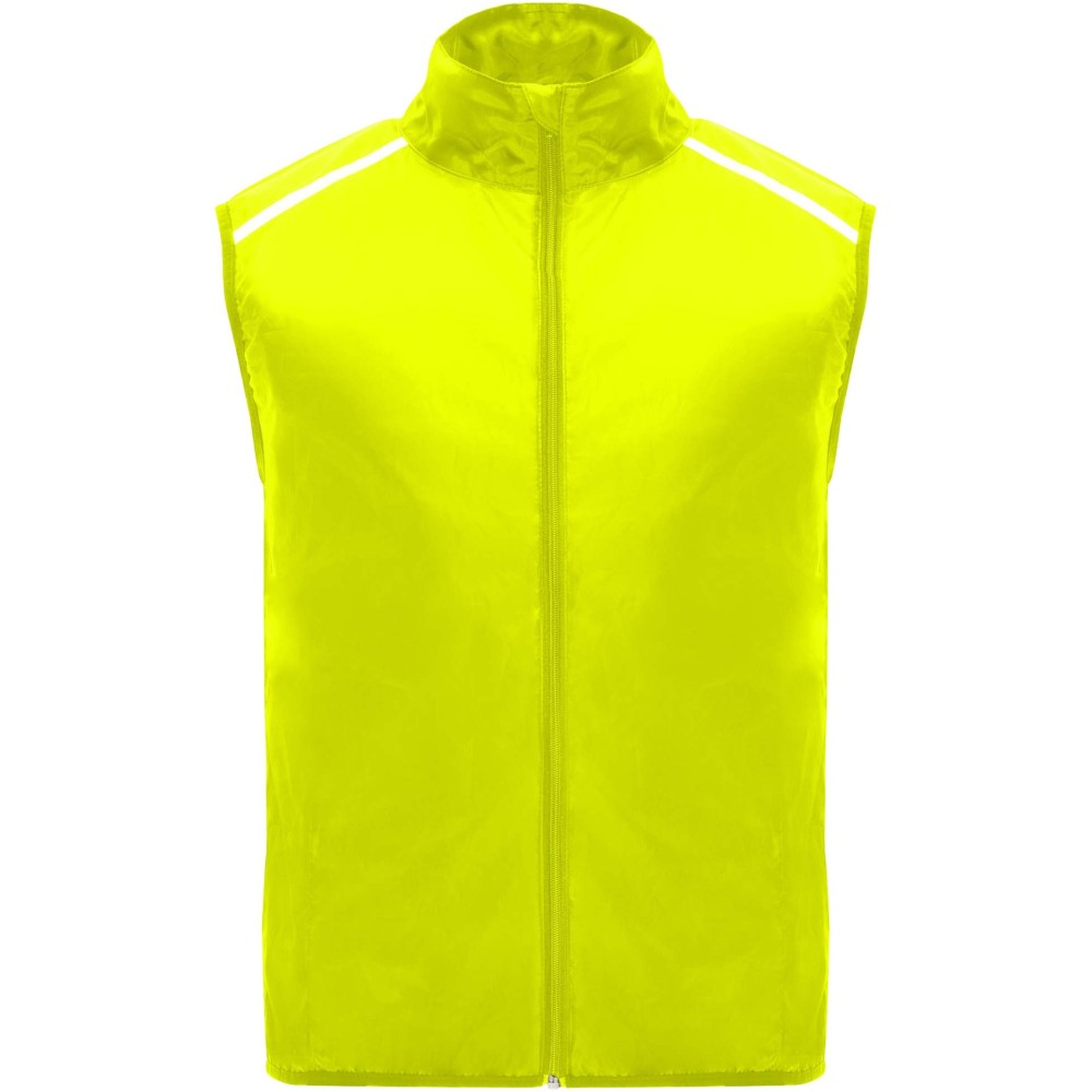 Szélálló és légáteresztő. Elülső cipzár azonos színű állvédővel. Rugalmas szegély a karkivágásnál és az alján. A hát alsó része mikroperforált anyagból készült. Fényvisszaverő csíkok a vállán. Zseb rugalmas pánttal, amelybe a mellényt el lehet csomagolni. Eltávolítható címke. Emblémázás: Szitanyomás