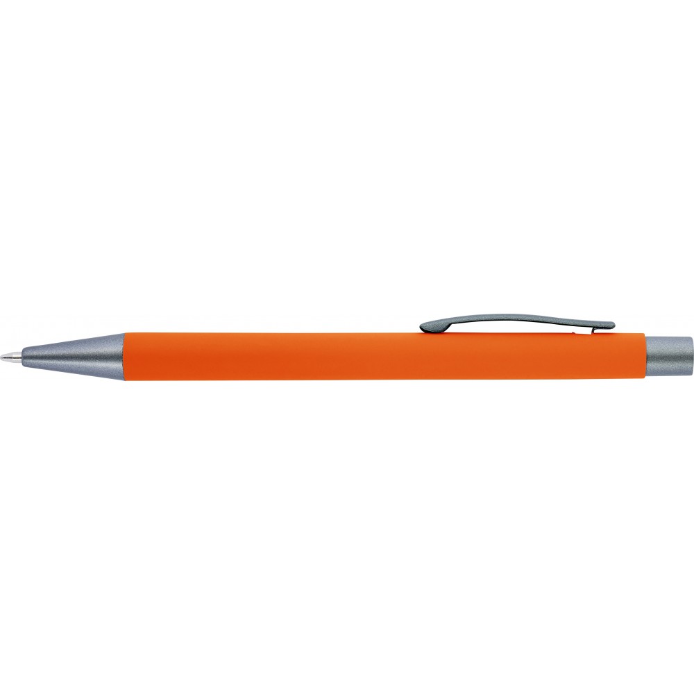 Golyóstoll gumis bevonattal, kék tollbetéttel. A hegy, klipsz és a nyomógomb egyforma sötétszürke színű. ABS, alumínium. Emblémázás: Gravírozás, UV nyomtatás