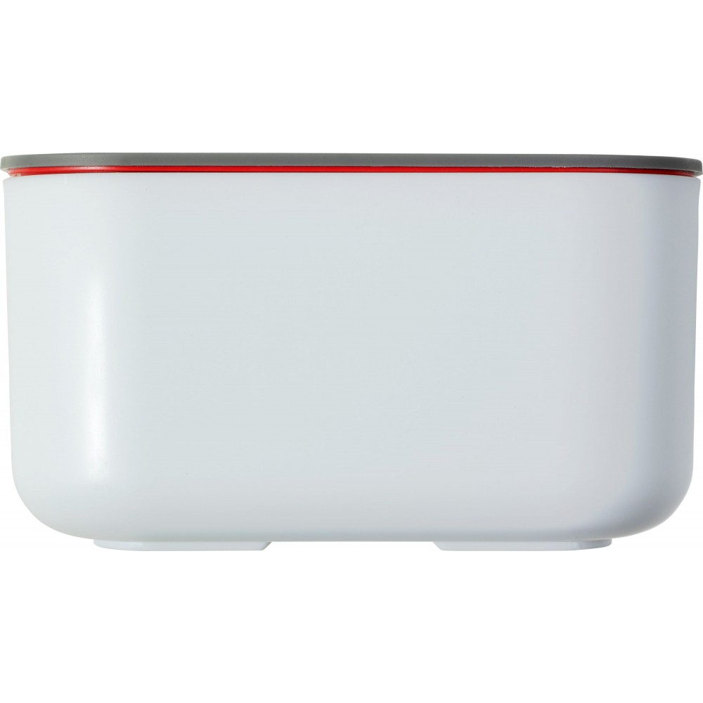 Ételdoboz egy belső elválasztóval. A fedélen lévő zárószerkezet telefontartóként is használható. Fedél nélkül mikrózható, csak a doboz. Űrtartalom: 850 ml. PP BPA-mentes műanyag. Emblémázás: Tamponnyomás, UV nyomtatás