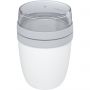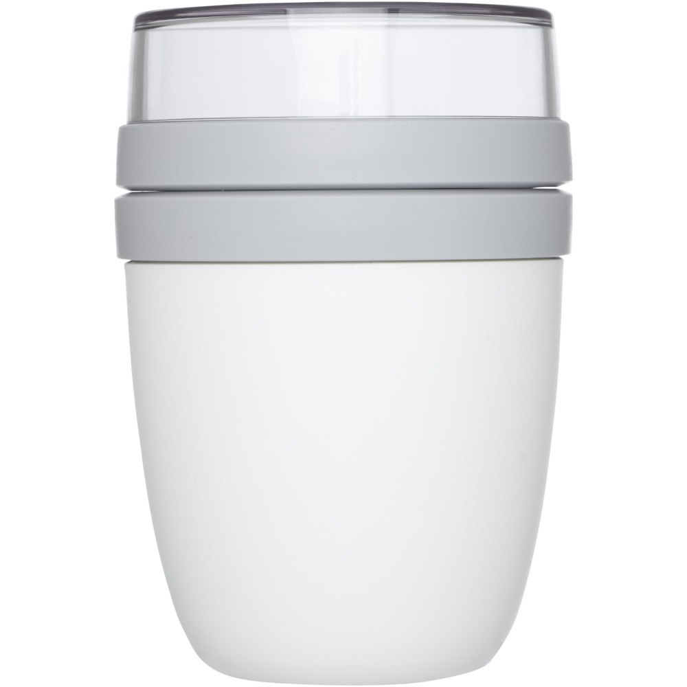 Ételtartó edény két rekesszel. Mindkét tartálynak külön fedele van. A felső, átlátszó rész űrtartalma 200 ml. Az alsó edény 500 ml-es. Fagyasztóba, mikrohullámú sütőbe (fedél nélkül), és mosogatógépbe tehető. A felső, átlátszó rész nem tehető mikrohullámú sütőbe. Szivárgásmentes. BPA mentes. PP műanyag, PCTG műanyag. Emblémázás: Tamponnyomás