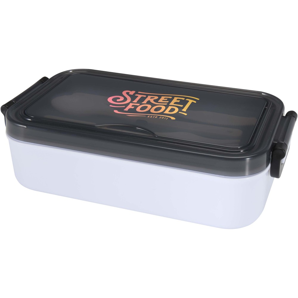 Tedd egyszerűvé az étkezést ezzel a stílusos ételtároló dobozzal és hozzáillő evőeszköz készlettel. Tágas rekesze frissen és rendezetten tartja az ételeket, így mindig készen állnak a fogyasztásra. A mellékelt evőeszközök a doboz tetején található külön rekeszben kaptak helyet, ami megkönnyíti a szállítást - tökéletes választás munkába, iskolába vagy utazáshoz. Emblémázás: UV nyomtatás