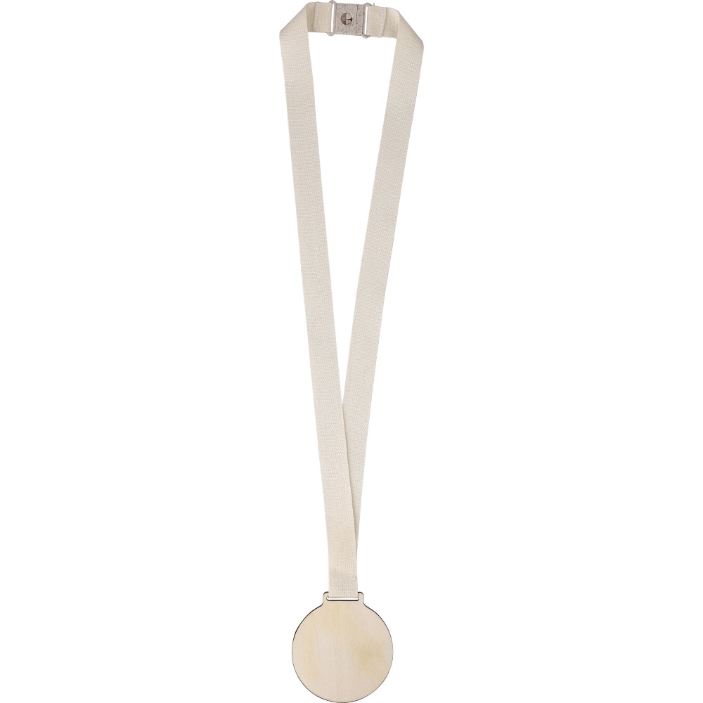 7 cm átmérőjű és 4 mm vastagságú hársfa medál 90 x 2 cm-es pamut nyakpánttal és környezetbarát búzaszalma-PP keverék biztonsági csattal a kényelem érdekében. Emblémázás: Gravírozás, Tamponnyomás