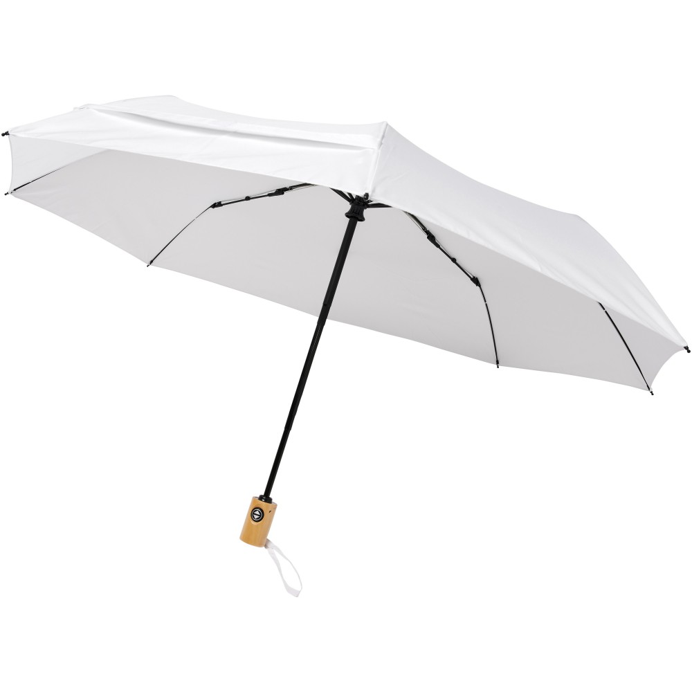Összecsukható 21 -es esernyő. Erős fém váz, üvegszálas szerkezet. Fa nyele és az újrahasznosított RPET alapanyag miatt jó választás azok számára, akiknek fontos a fenntartható szemlélet. Emblémázás: Szitanyomás