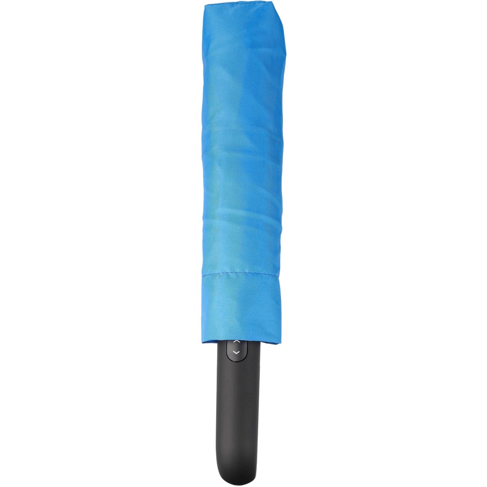 Összecsukható, automata esernyő (21 inch), hat panellel és acél vázzal. Az esernyő tépőzáras záródásán RPET címke található, műanyag karabineres fogantyúval, tokkal. Szélálló. Anyaga: RPET 190T. Emblémázás: Szitanyomás