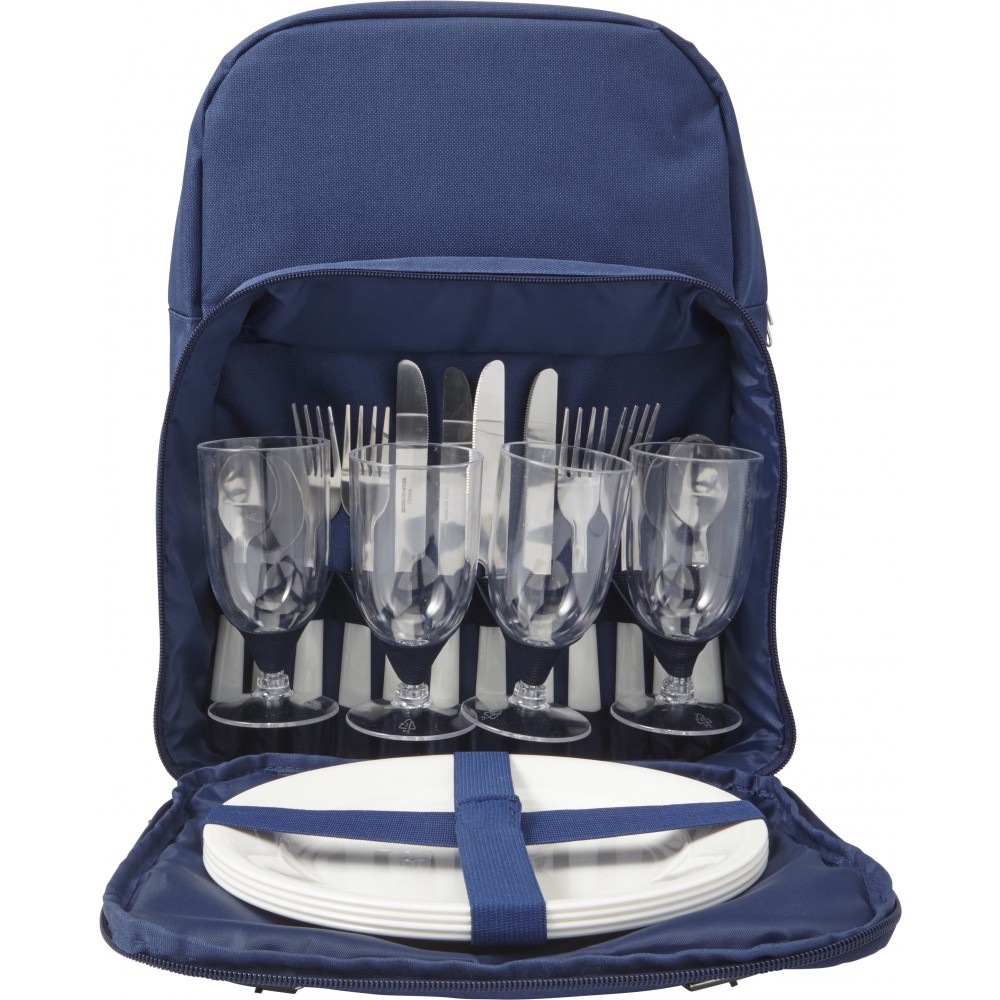 Piknikhátizsák hűtőrésszel, műanyag étkészlettel és evőeszközökkel 4 fő részére. 600D poliészter. Emblémázás: Szitanyomás