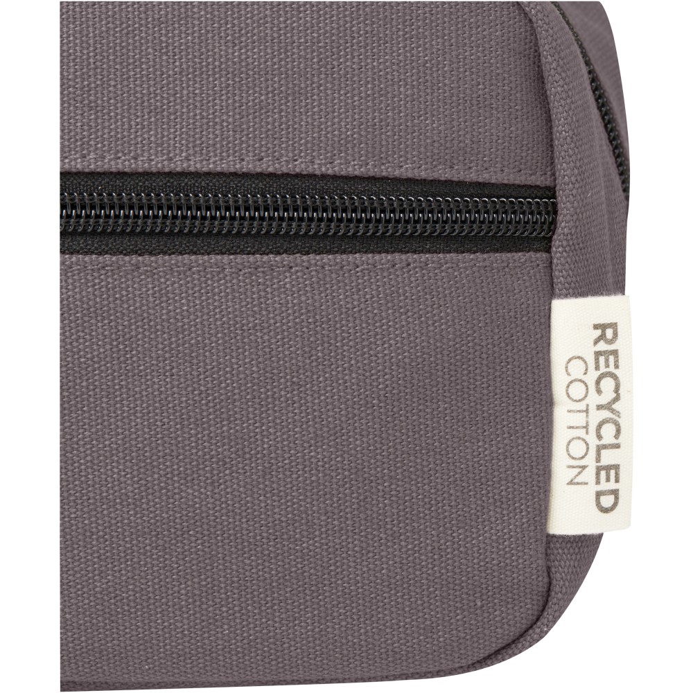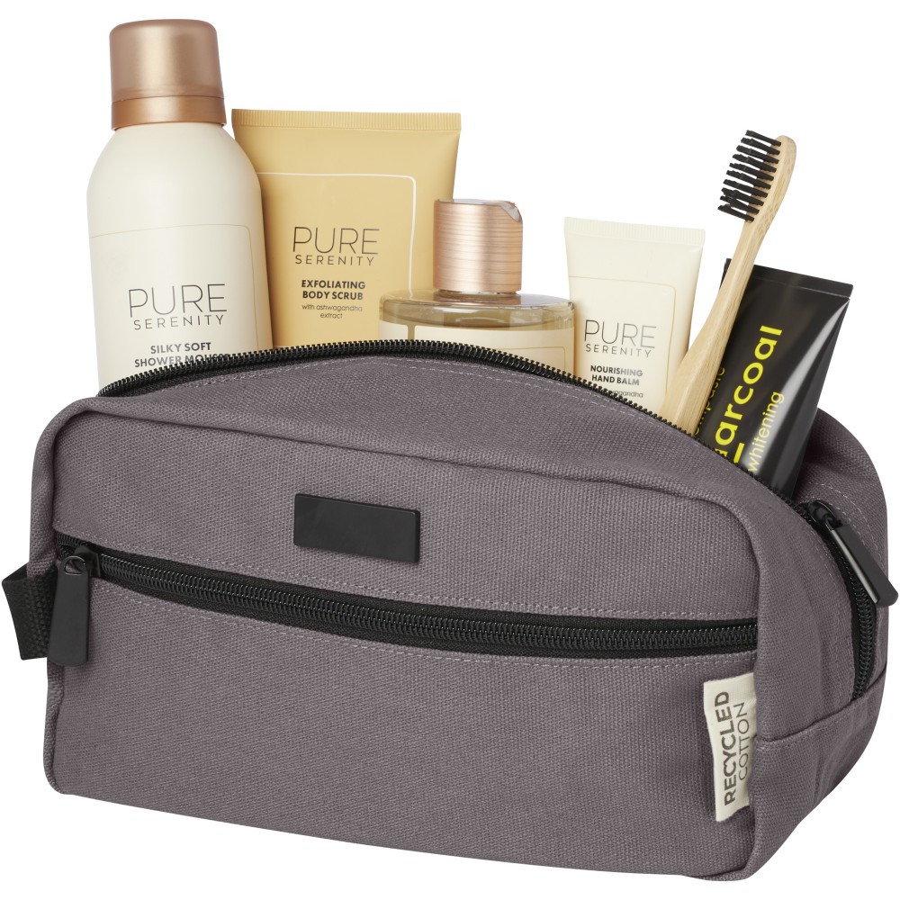 GRS tanúsítvánnyal rendelkező újrahasznosított vászonból és GRS tanúsítvánnyal rendelkező RPET béléssel készült piperetáska. Egy cipzáras elülső zsebbel és egy cipzáras főrekesszel, szervezőzsebekkel és pánttal rendelkezik. Fémlapja gravírozható. Űrtartalom: 3,5 liter. Emblémázás: Szitanyomás