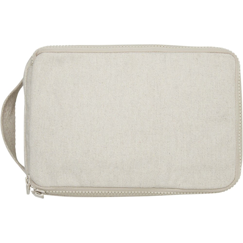 Piperetáska 500 g/m2 újrahasznosított pamutból és poliészterből, tágas fő rekesszel, biztonságos cipzáras záródással és több belső zsebbel, amely ideális piperecikkek tárolására. Sokoldalú kialakításának köszönhetően kisebb tárgyak - például zoknik vagy töltők - rendszerezésére is kiváló, így a csomagok rendezetten tarthatók. A táska Cyclo újrahasznosított szálakat tartalmaz, amelyek előválogatott hulladékból készülnek, és ennek megfelelően alakul a fonal színe is. Ezek a szálak nemcsak a primer nyersanyagok iránti igényt csökkentik, hanem elköteleződést is mutatnak a körforgásos szemlélet iránt, elősegítve a hulladékcsökkentést és a zárt rendszerű gyártást. Minden táskához tartozik egy Aware nyomkövető is, amelynek QR-kódja révén nyomon követhető a termék eredete és útja, ezáltal fokozva az ellátási lánc átláthatóságát, és erősebb kapcsolatot teremtve a felhasználó és a termék gyártási folyamata között. Emblémázás: Szitanyomás