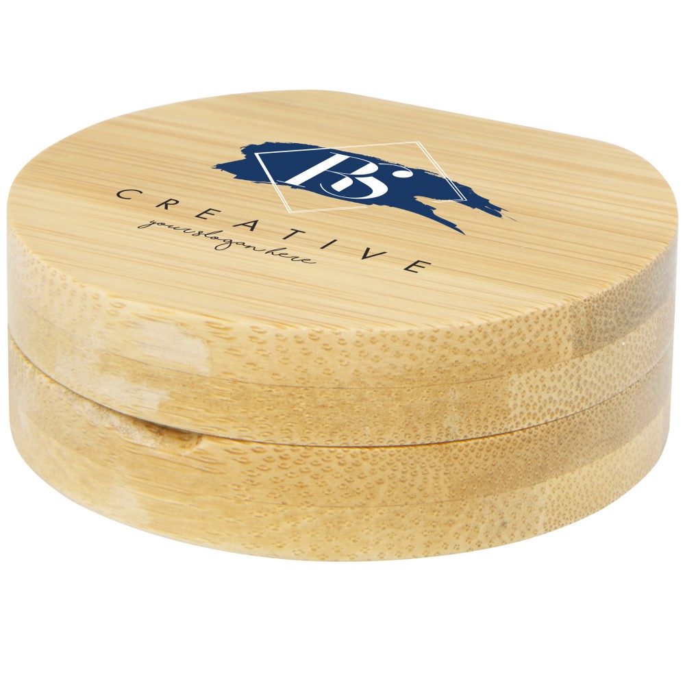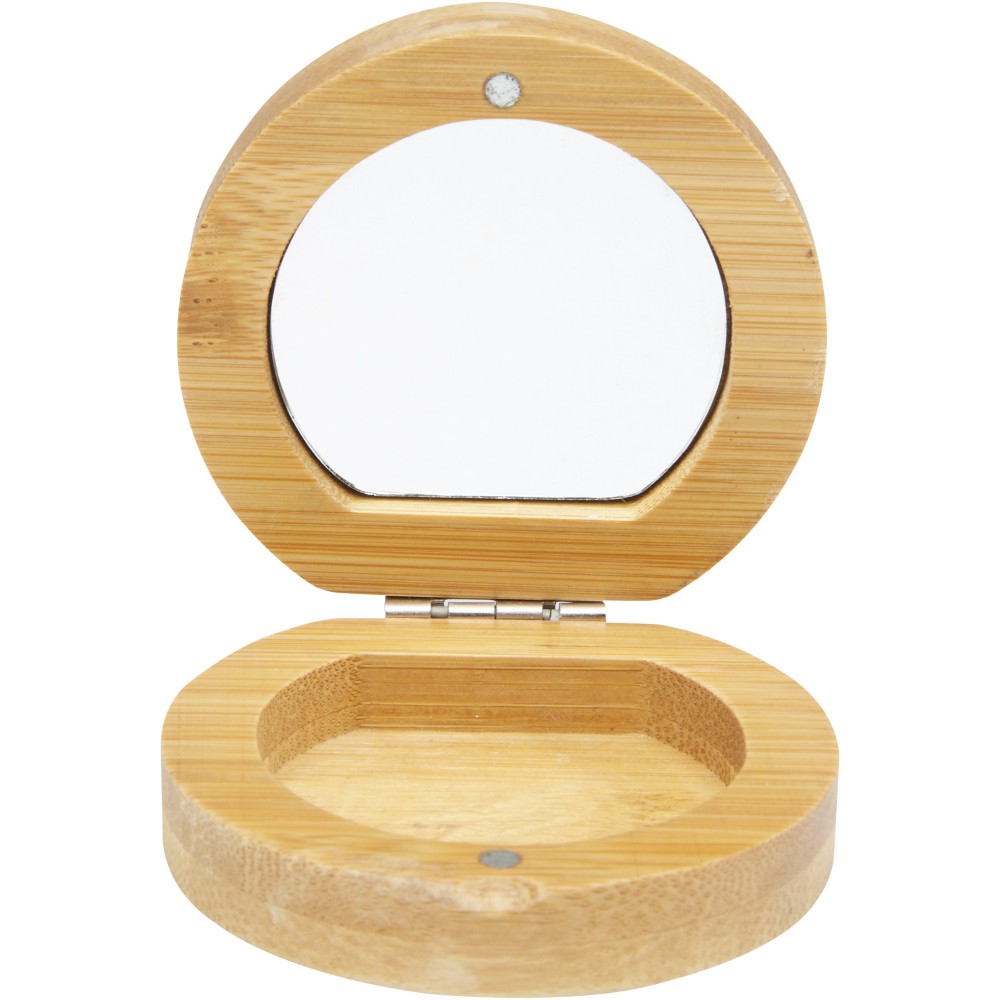Kompakt bambusz zsebtükör utazáshoz vagy napi bőrápoláshoz vagy sminkhez. A tükör alján van egy kis rekesz az apró kiegészítők számára. A felhasznált bambusz forrása és előállítása a fenntartható szabványok szerint történik. Emblémázás: Gravírozás, Tamponnyomás