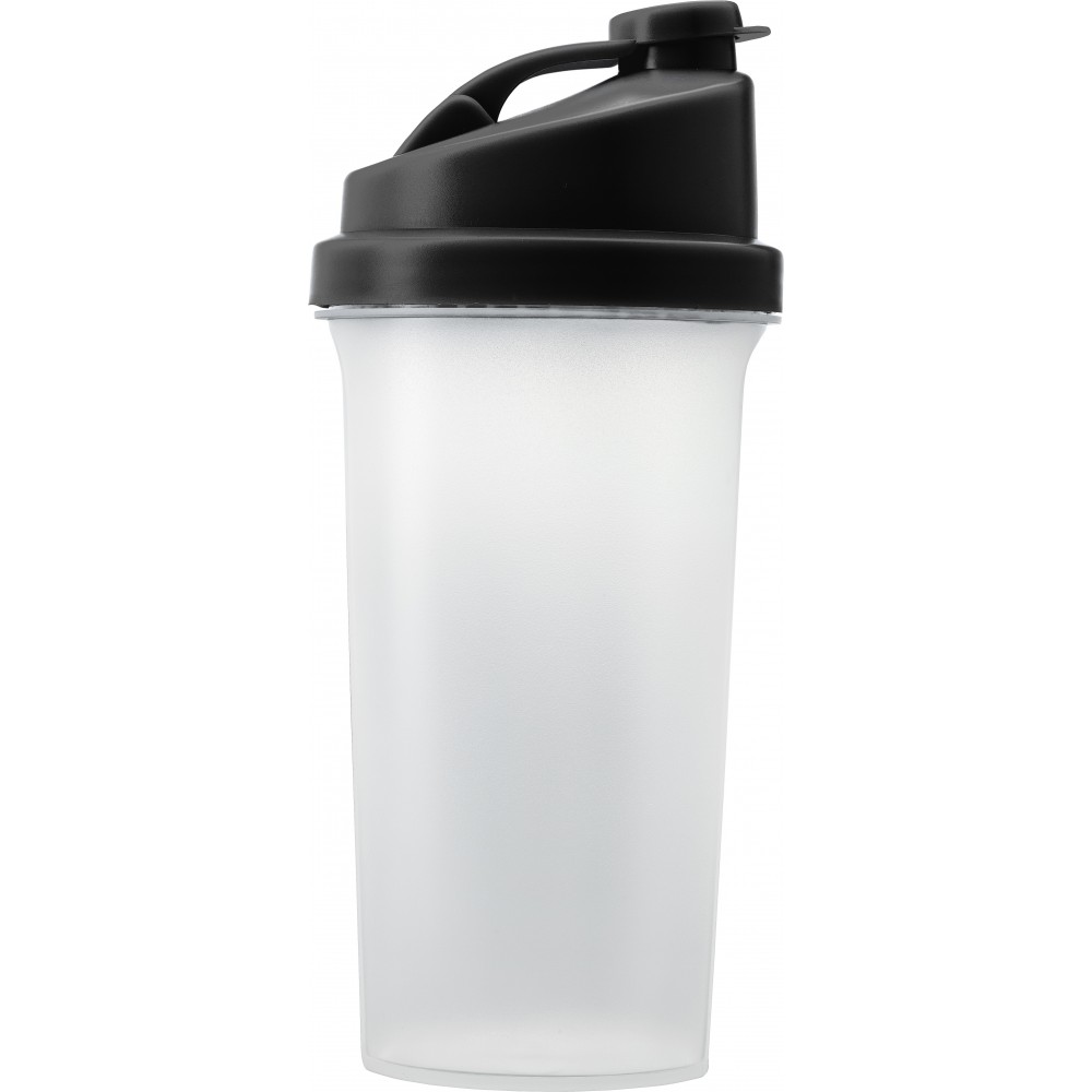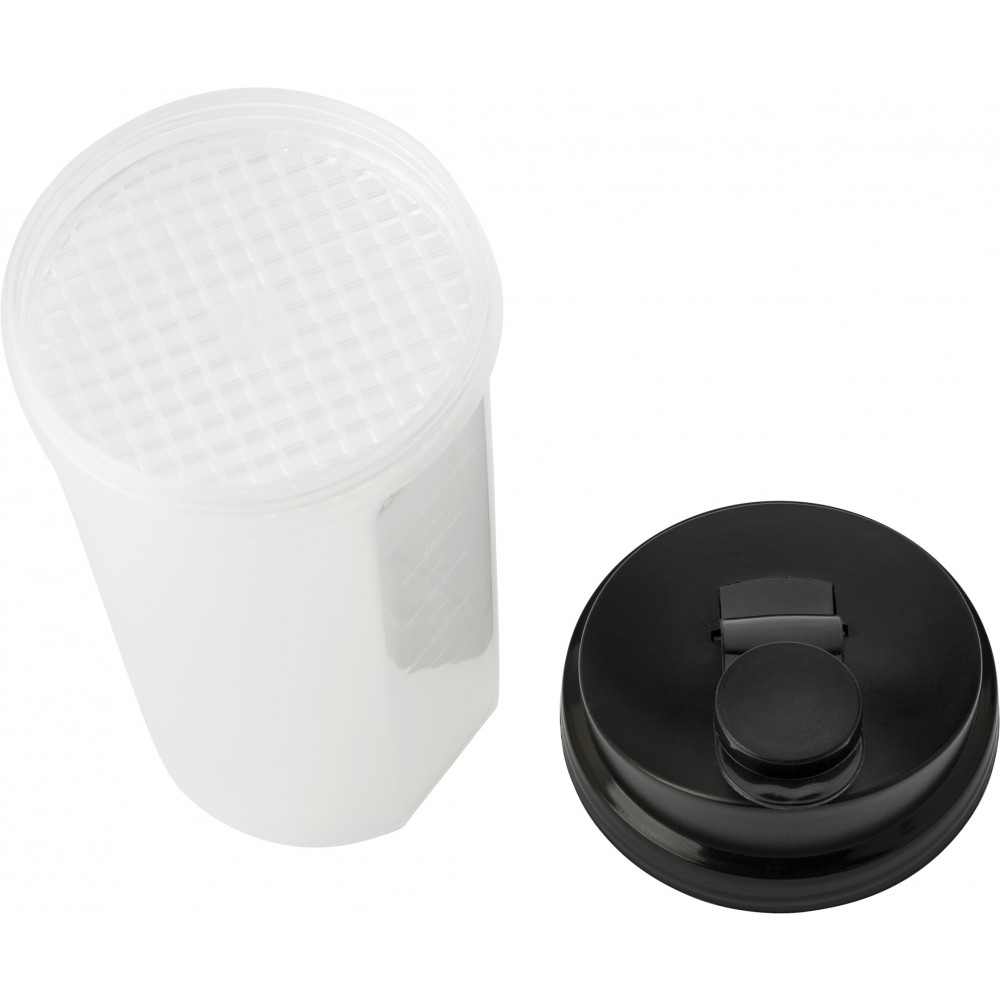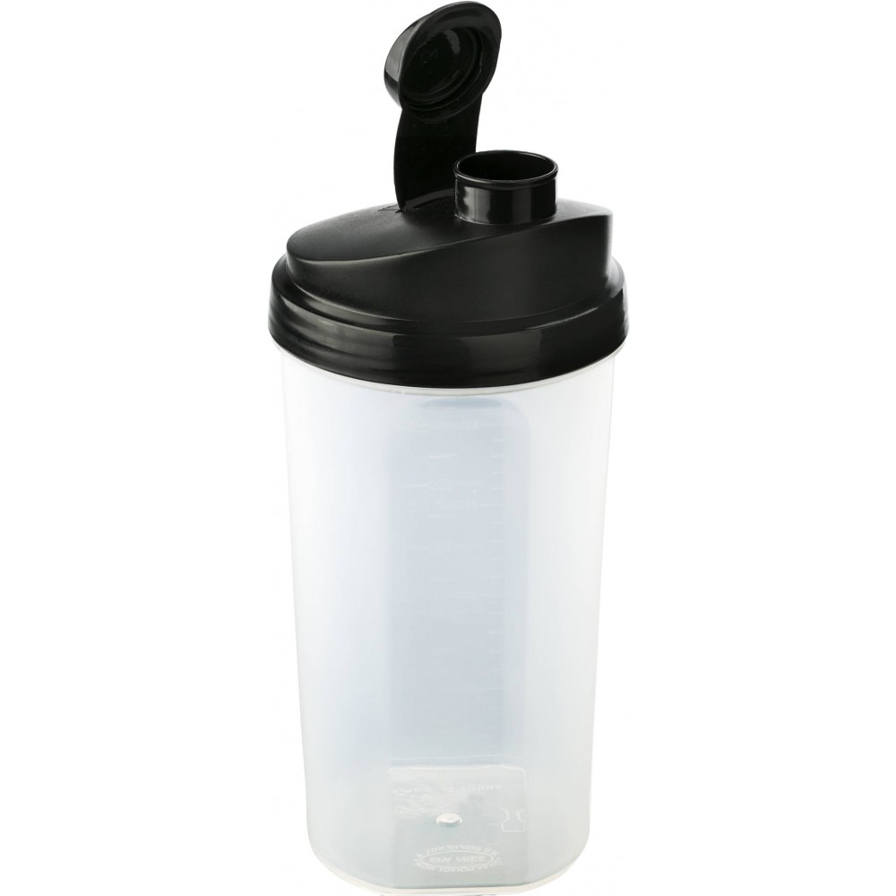 Műanyag protein shaker (kb. 700 ml-es) szűrővel és színes fedéllel, egyik oldalán ml, másik oldalán OZ beosztással. Nem szivárgásmentes. Mosogatógépben nem tisztítható. BPA-mentes műanyag. Emblémázás: Körszita, Tamponnyomás