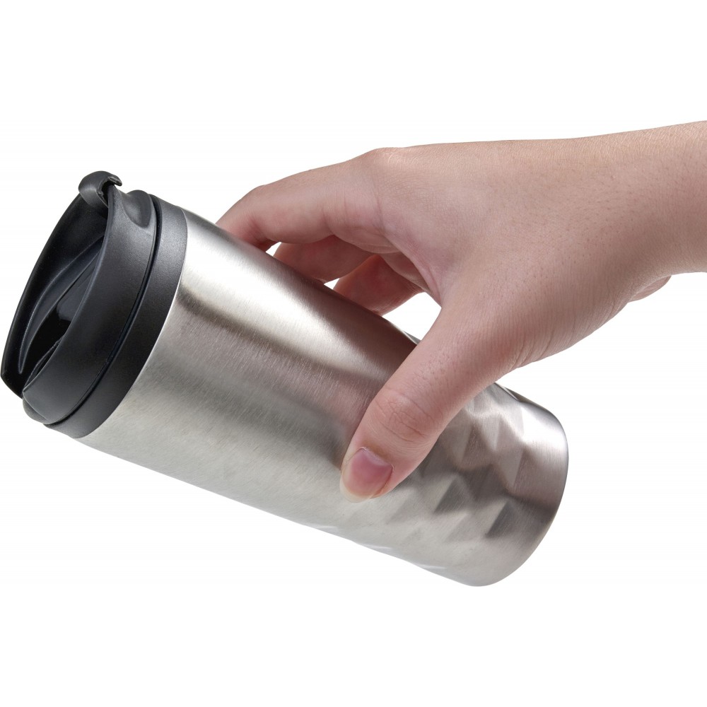 Duplafalú fedeles pohár. 300 ml. Rozsdamentes acél és BPA-mentes műanyag. Nem szivárgásmentes és nem mosogatógépálló termék. Emblémázás: Gravírozás, Körszita, Tamponnyomás