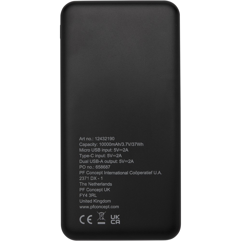 Újrahasznosított ABS műanyagból készült powerbank. A powerbank hosszú élettartamú, A minőségű 10.000 mAh lítium-polimer akkumulátort tartalmaz a gyors töltéshez. A teljesítményjelzők jelzik a töltöttségi szintet. Type-C bemenet 5V/2A, Micro USB bemenet 5V/2A, kettős USB-A kimenet 5V/2A, teljes teljesítmény 10W. Szállítása egy 30 cm-es TPE 2A USB-A-Type-C töltőkábellel, kraftpapír díszdobozban történik. Emblémázás: Tamponnyomás, UV nyomtatás