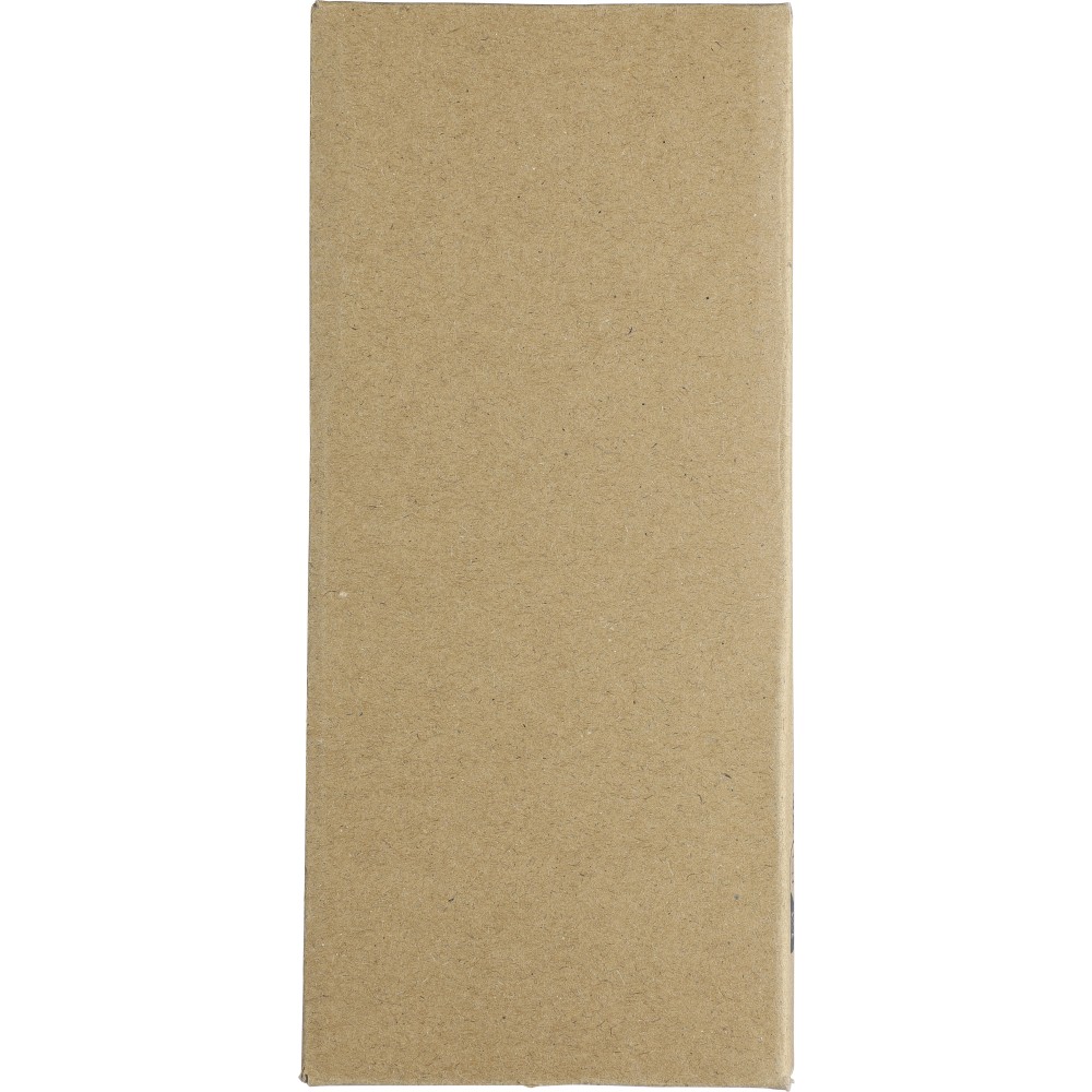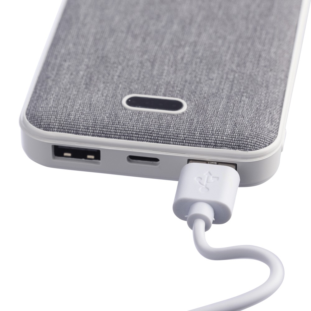 Újrahasznosított ABS és rPET anyagból készült powerbank 10.000 mAh kapacitással, dual USB és USB-C porttal (5V/2.4A), töltéskijelzővel, tetején rPET logóval. 30 cm-es kábel tartozik hozzá. Csomagolása kraftpapír doboz. Emblémázás: Tamponnyomás