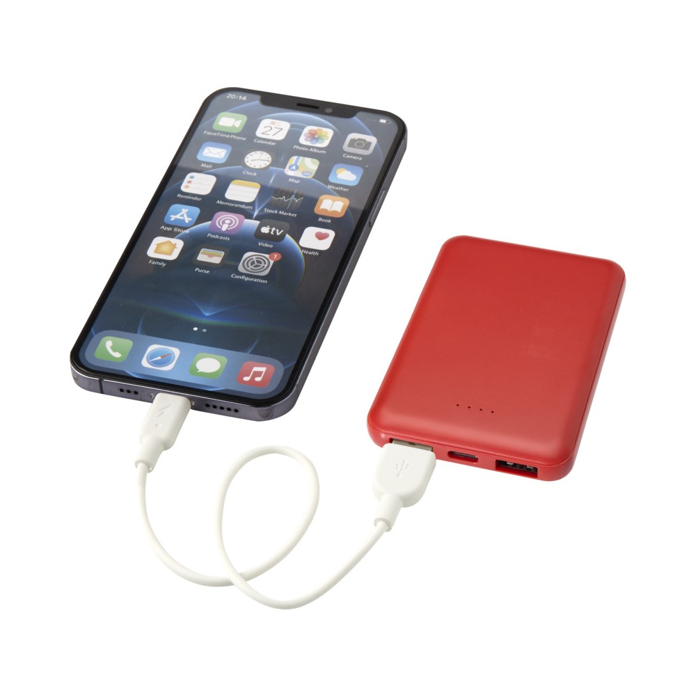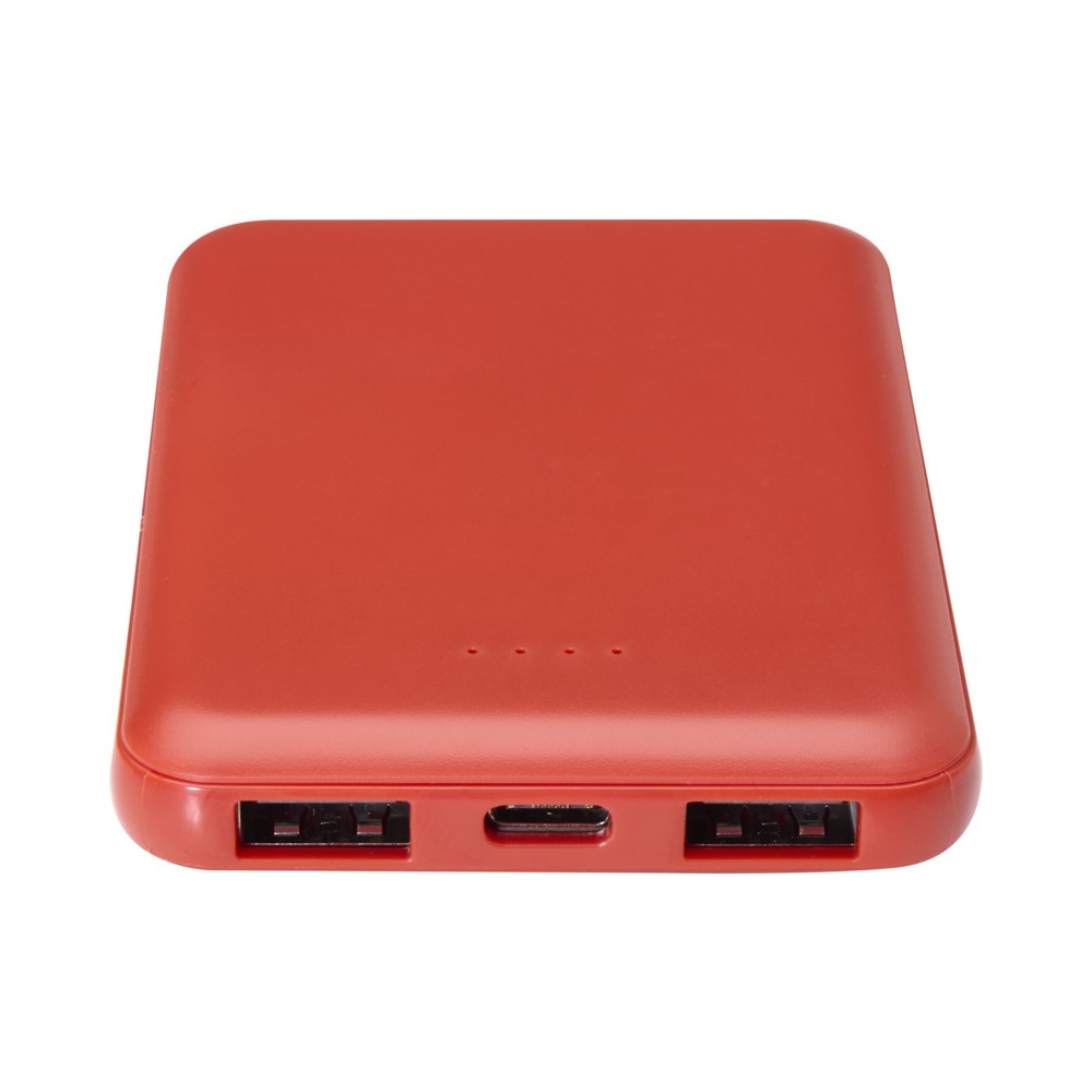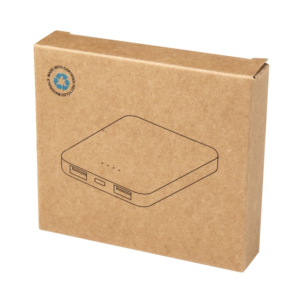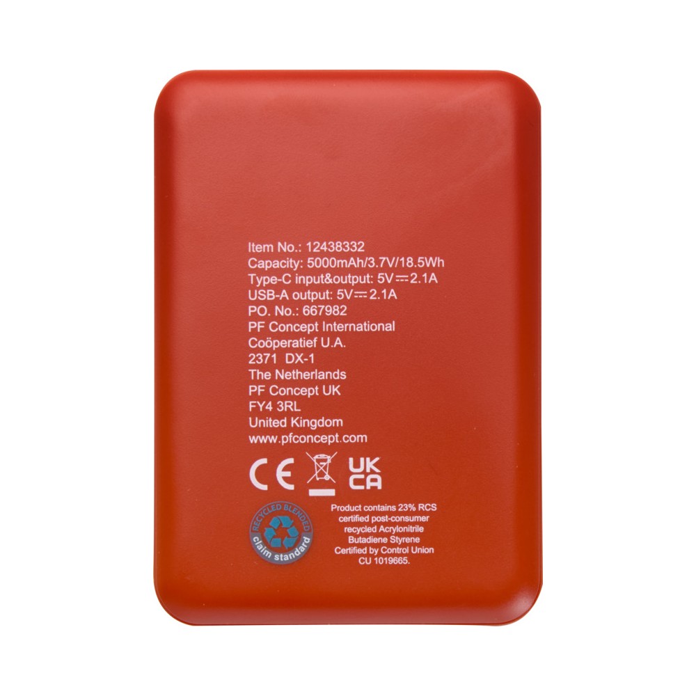 Karcsú és elegáns kialakítású powerbank, Type-C bemeneti/kimeneti porttal és 2 db USB-A porttal, amelyek lehetővé teszik három eszköz egyidejű töltését. A powerbank 5000 mAh kapacitású lítium-polimer akkumulátorral rendelkezik, amely max. 10W teljesítményt biztosít. A powerbank 23%-ban RCS tanúsítvánnyal rendelkező újrahasznosított műanyagból készült. TPE Type-C - USB-A töltőkábellel szállítjuk. Emblémázás: Tamponnyomás