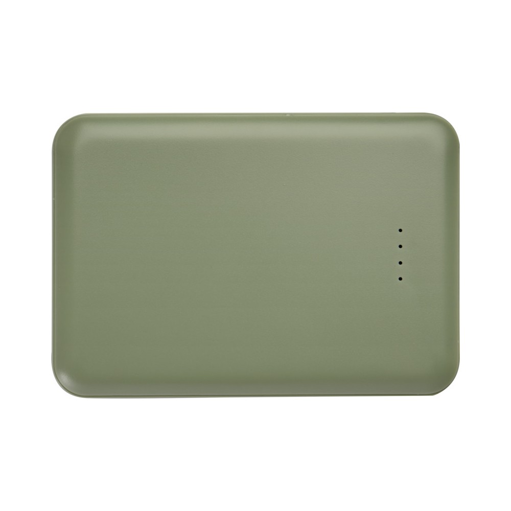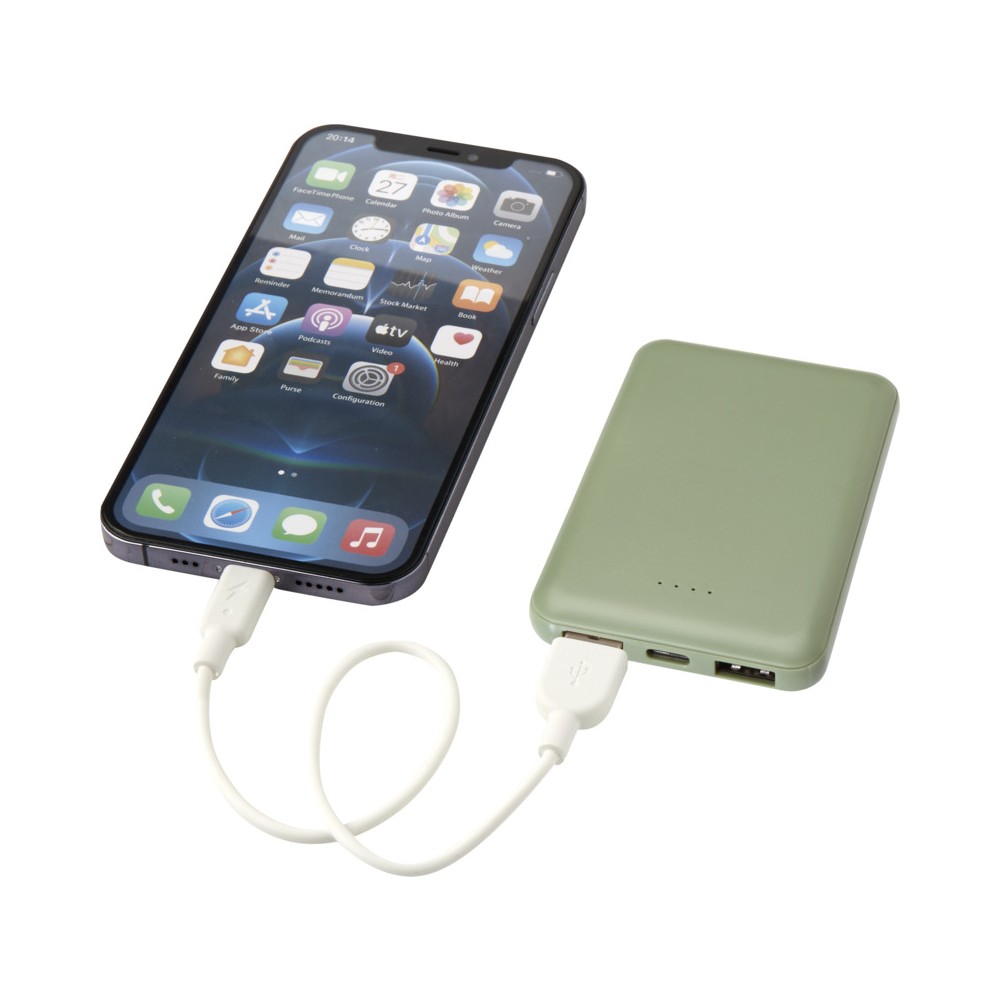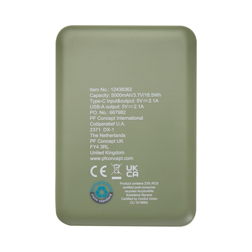 Karcsú és elegáns kialakítású powerbank, Type-C bemeneti/kimeneti porttal és 2 db USB-A porttal, amelyek lehetővé teszik három eszköz egyidejű töltését. A powerbank 5000 mAh kapacitású lítium-polimer akkumulátorral rendelkezik, amely max. 10W teljesítményt biztosít. A powerbank 23%-ban RCS tanúsítvánnyal rendelkező újrahasznosított műanyagból készült. TPE Type-C - USB-A töltőkábellel szállítjuk. Emblémázás: Tamponnyomás